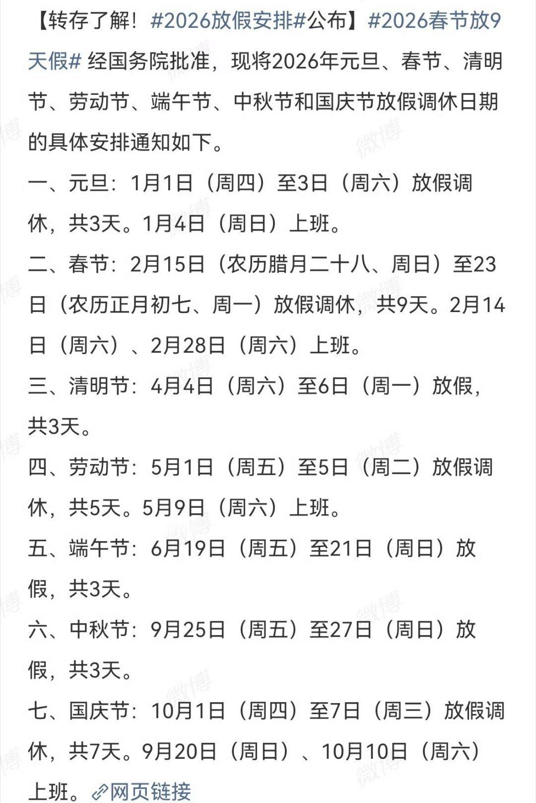 2026春节放9天假经国务院批准,现将2026年元旦、春节、清明节、劳动节、端