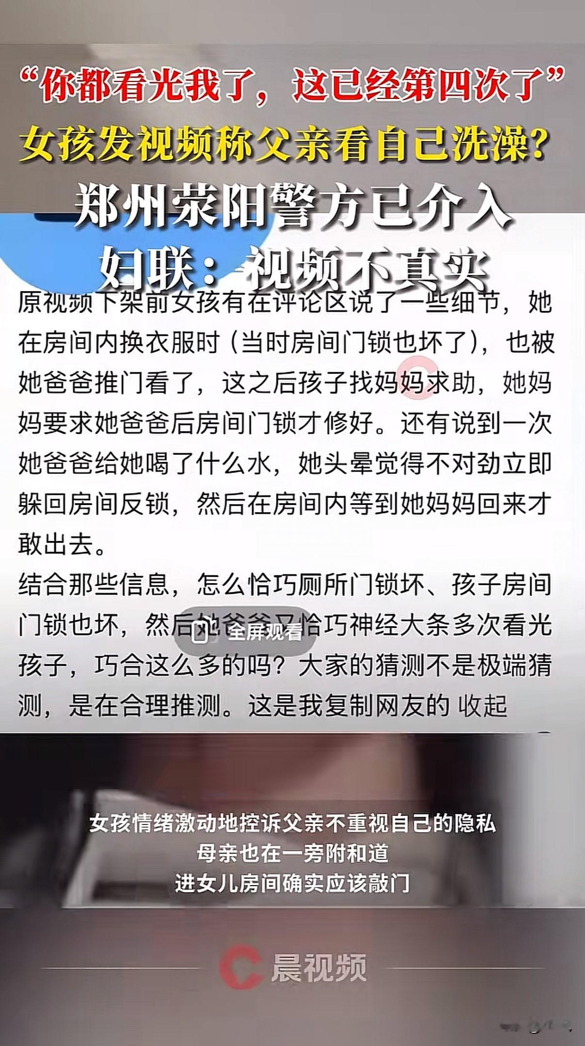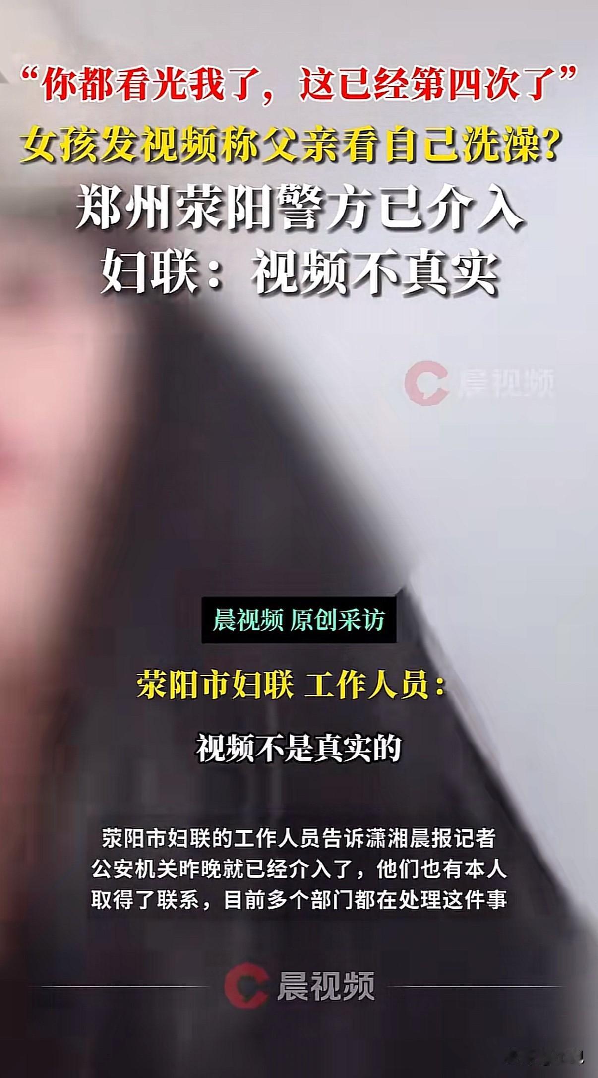 本来刷到那个视频,气得手都抖了。女孩带着哭腔说:“你都看光我了,这都第四次了!”她质问父亲为什么不敲门就进卫生间。母亲在旁边小声帮腔,说确实该敲门。结果父亲突然吼起来:“恶心就恶心,我看你干啥!”视频到这里就断了。 当时好多人都急了,担心这女孩会不会出事。 结果第二天,官方消息来了个急转弯。荥阳市妇联明确说:“她发那个视频不是真实的。”警方也证实已经介入,见到了女孩一家人,说孩子是安全的。原视频很快被删除了,女孩的社交账号头像也换成了中年风格。 现在网上分两派。有人觉得被耍了,白心疼一场;有人还是半信半疑,觉得视频里那一家人不像在演戏。 这事说白了就两种可能:要么是孩子为了博关注编了故事,要么是家里真有问题但被压下去了。如果是前者,这种消费公众善意的行为太可恨;如果是后者,那问题更严重。 警方和妇联都出动了,现在就看调查结果。假的就该处理造谣的,真的就该保护受害者。咱们也别急着下定论,让子弹再飞一会儿。 网络时代,真相反转太多。但无论如何,希望最后能有个清清楚楚的交代,别让大家的善心一次次被透支。