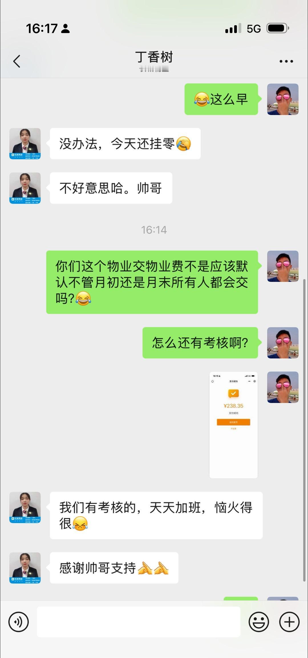 物业上个月20几号给我说“交这个月的物业费”,今天又发了一个让我“交这个月的物业费”,好奇怪,,我一看,好家伙今天才 4 号啊,虽然不管是月初还是月末都应该交,但这时间跨度也太奇怪了,我还以为一个月交两次呢。 再问一下发现有考核,那可能我是“最好欺负那个?” 很奇怪,物业费什么时候都会交我们是要考核,如果有人注定不交,那考核也没意义啊。