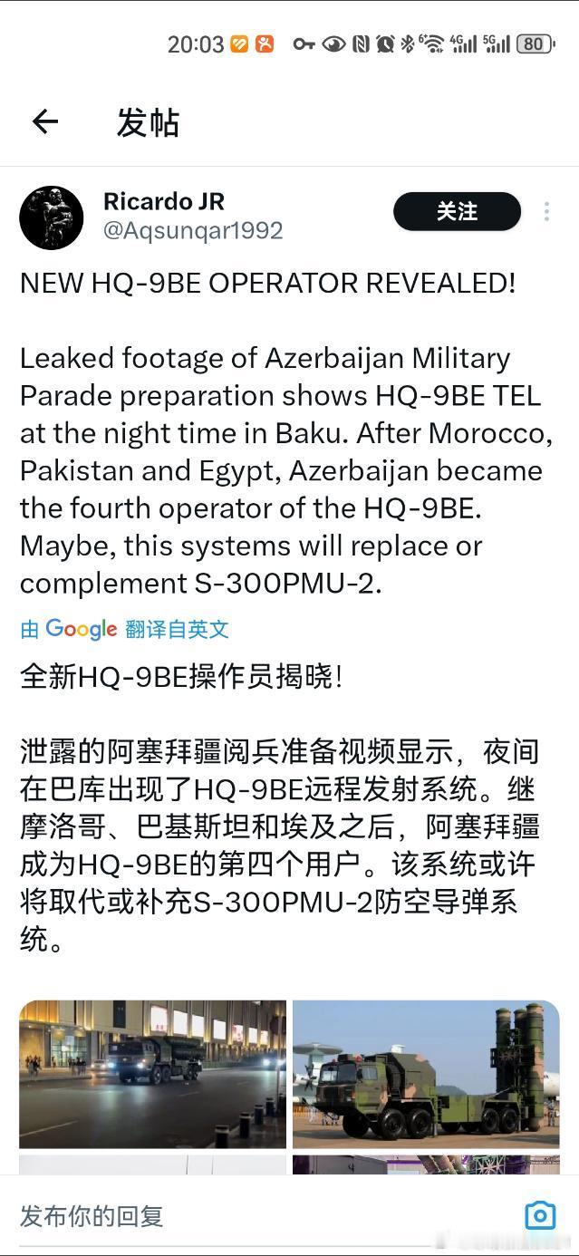 日耳曼赢学 据外国自媒体报道,阿塞拜疆进口HQ9BE对抗超级苏30MKI