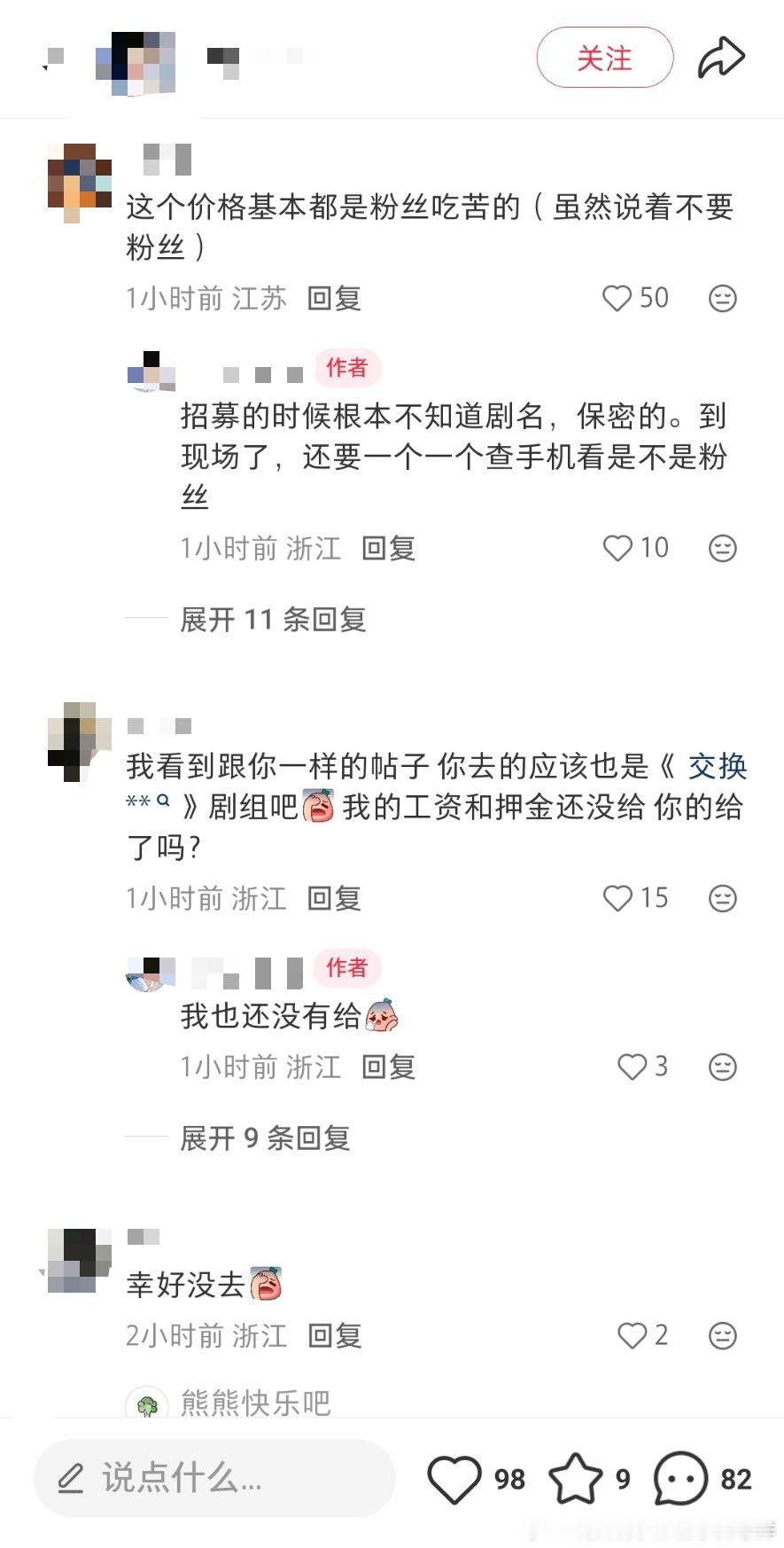 《交换人生》剧组被群演吐槽只给70块钱,工作时间还长,除了粉丝没人愿意去[笑cry]但是剧组还不要粉丝,一个个查手机[笑cry]咱就是说,耀客这么抠么[允悲]