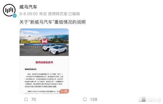 本次威马汽车官宣“好事将近”是否意味着威马汽车即将复产,目前还不确定。针对威马汽车口中的“好事将近”,有记者从相关知情人士处了解,威马汽车预计将在本月底开一个关于新车的发布会,并设计产品、网络、供应商等。车评观察大v聊车