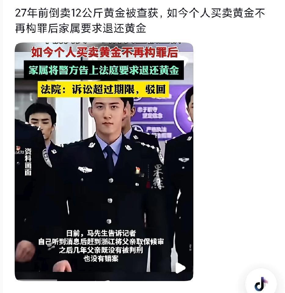 27年前12000克黄金被没收,家属求退还,法院:超期驳回! 12.5公斤黄金遭扣押!20年前因销售黄金被判有罪,如今政策允许却无法讨回。法律更新了,公平不该缺席,盼望事件尽快明朗👊 法律条文变了,旧案还有机会平反吗?当年马先生的父亲带着12.5公斤黄金从甘肃跑到浙江做生意,结果被台州警方扣下黄金还惹上了官司。放到今天,这完全是正当生意啊! 2003年那会儿政策突然调整,个人买卖黄金一下子变得合法。可二十年过去了,警方只回应说“处理符合规定”,让价值几百万的黄金就这么没了着落。 更让人心塞的是,真有类似情况成功讨回的案例!吉林的于润龙通过国家赔偿拿回了黄金,可马先生一家却因为“超过诉讼时效”被卡住了。老父亲如今上了年纪身体也不好,家人只想要个明白交代:当年的黄金到底怎么处置的?为什么相似的情况结果却天差地别? 法律进步本来应该让老百姓受益,但新旧法规之间的空白,反而成了维权路上最难跨的坎儿。这算不算是历史遗留问题最典型的例子? 你们怎么看这种因政策变化产生的陈年旧案?该不该特殊情况特殊处理?来评论区说说你的想法!