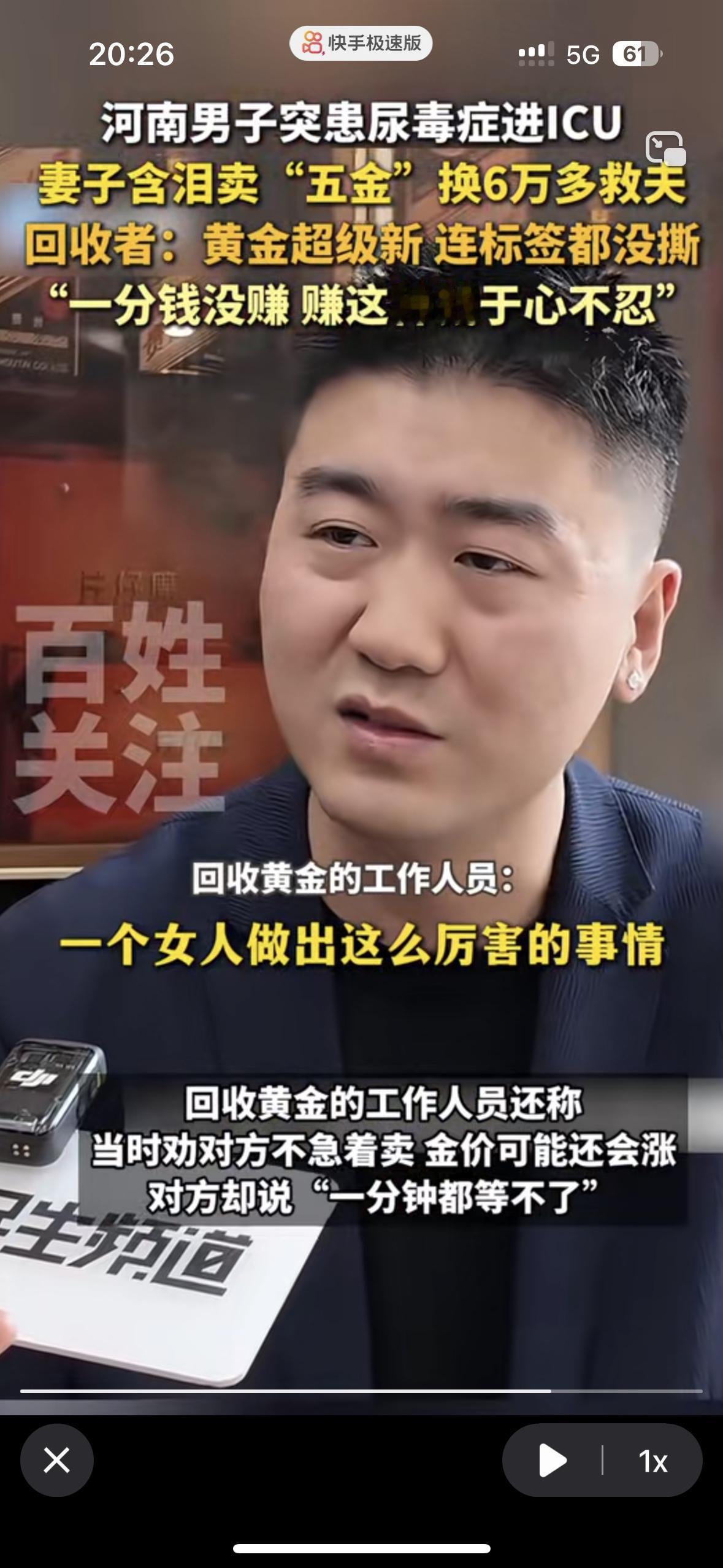 真羡慕这位尿毒症的男人,他娶到了一位好老婆 回收黄金的大哥说,一位找他来卖黄金的女人,他一分钱都没赚。因为她是把自己结婚的5金拿来卖,而且是为了救她老公 她老公突然身患尿毒症进了ICU,一个女人把自己所有的首饰拿出来卖,大哥说可以等等还会涨价,她却说等不了得救人 这样好的女人一定会有好报,希望她救的老公长命百岁一辈子好好爱她。