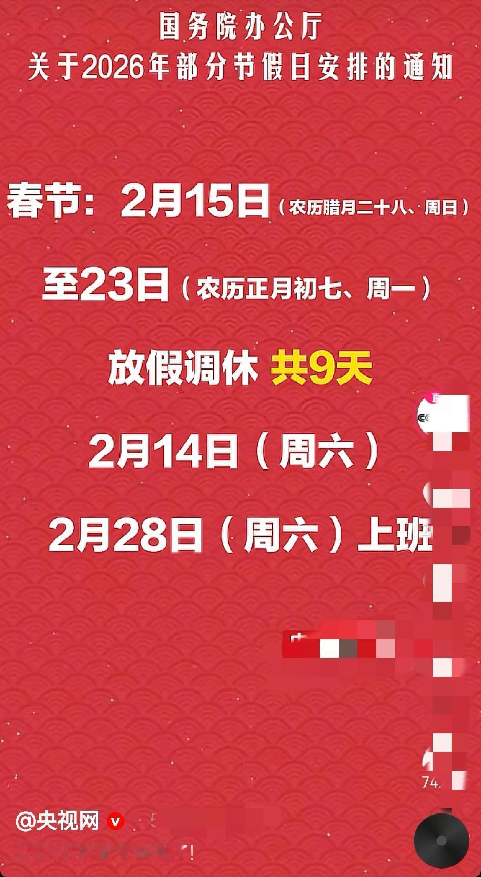 这春节假期直接杀疯了! 2026年这波放假安排也太懂打工人了吧——腊月二十八就开始放,一直连到正月初七,整整9天!