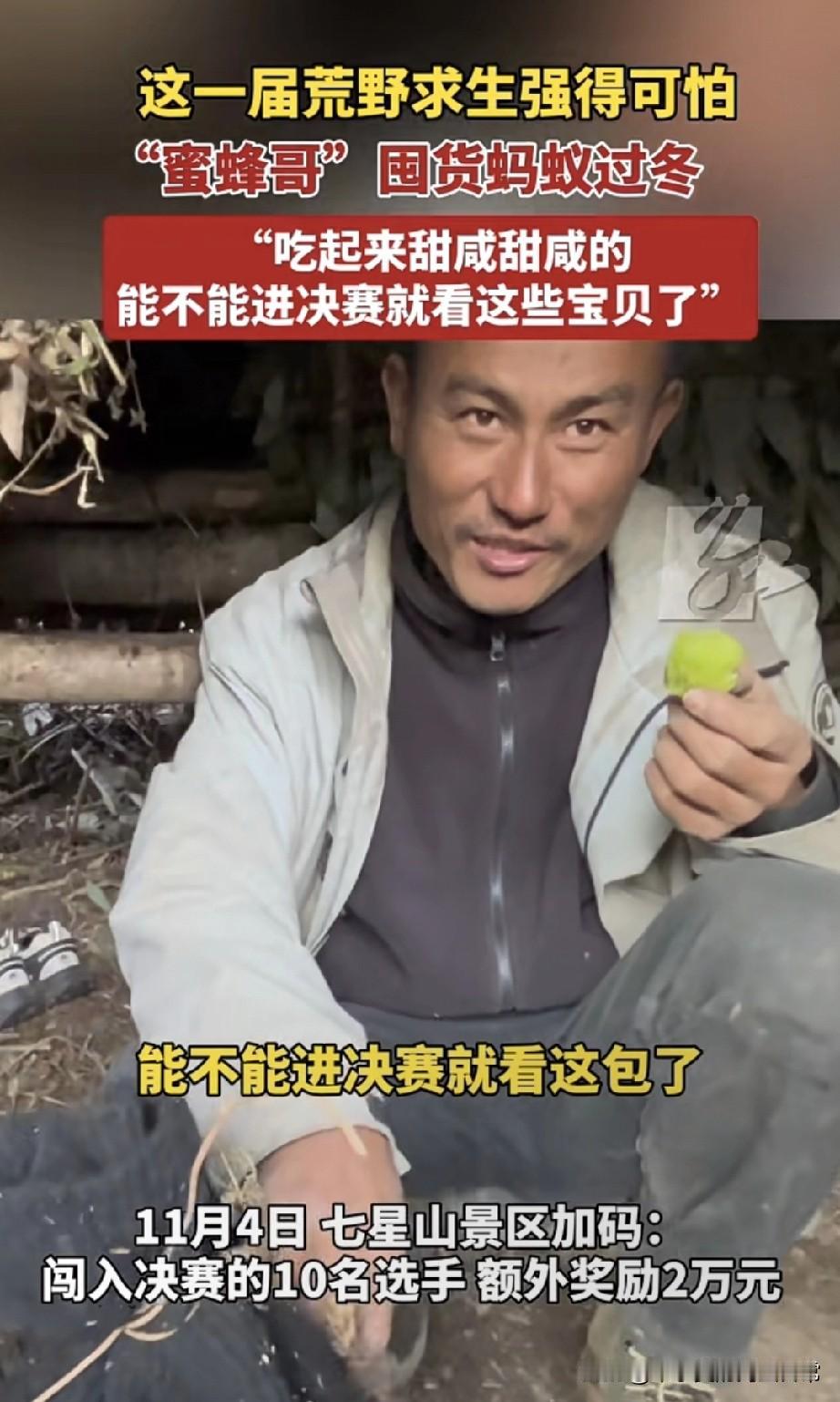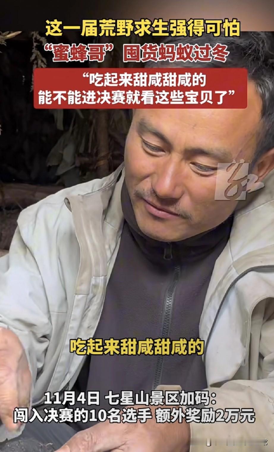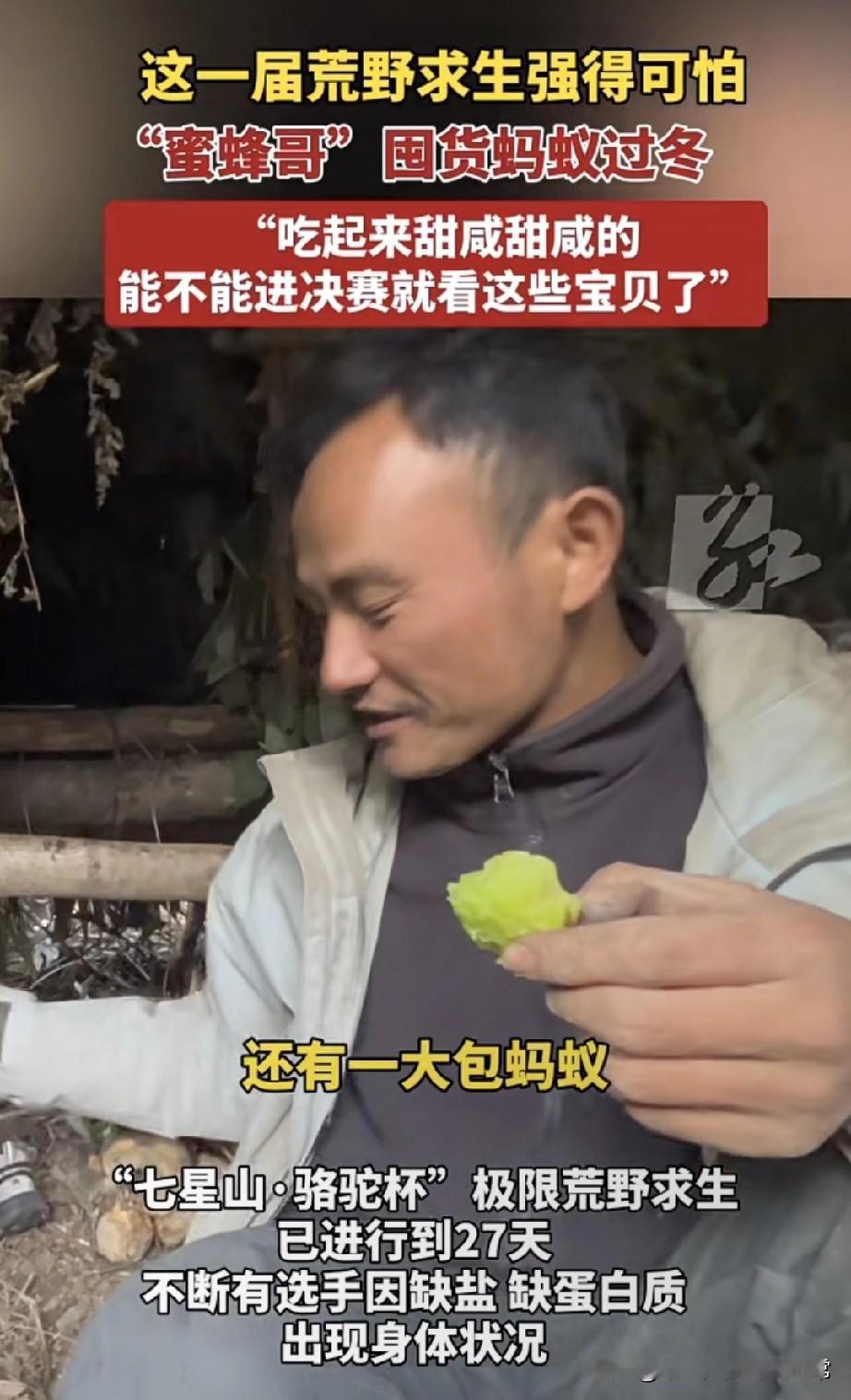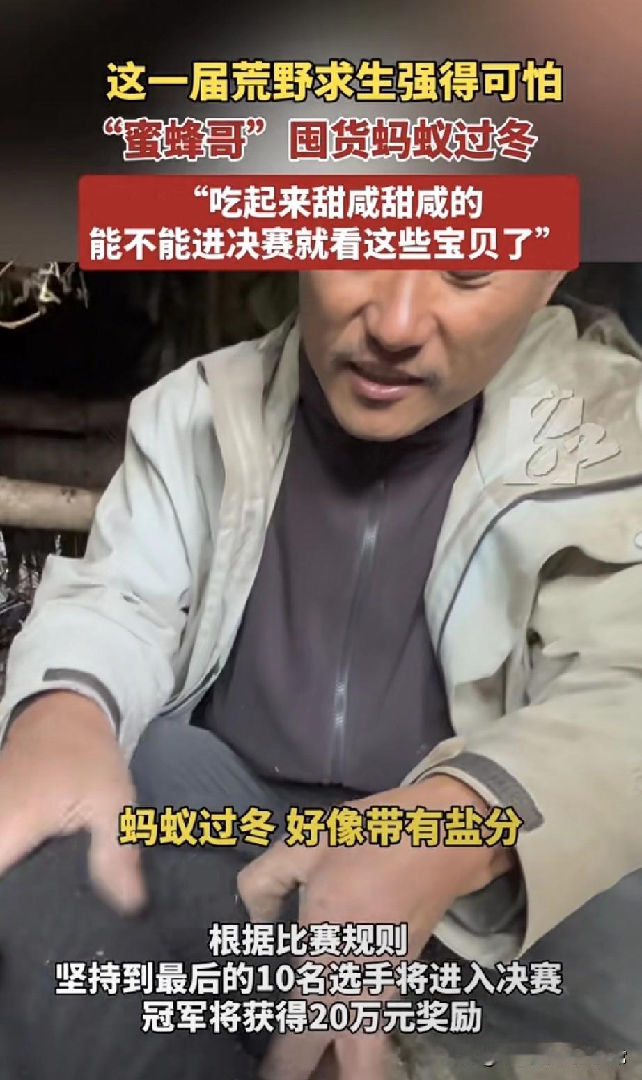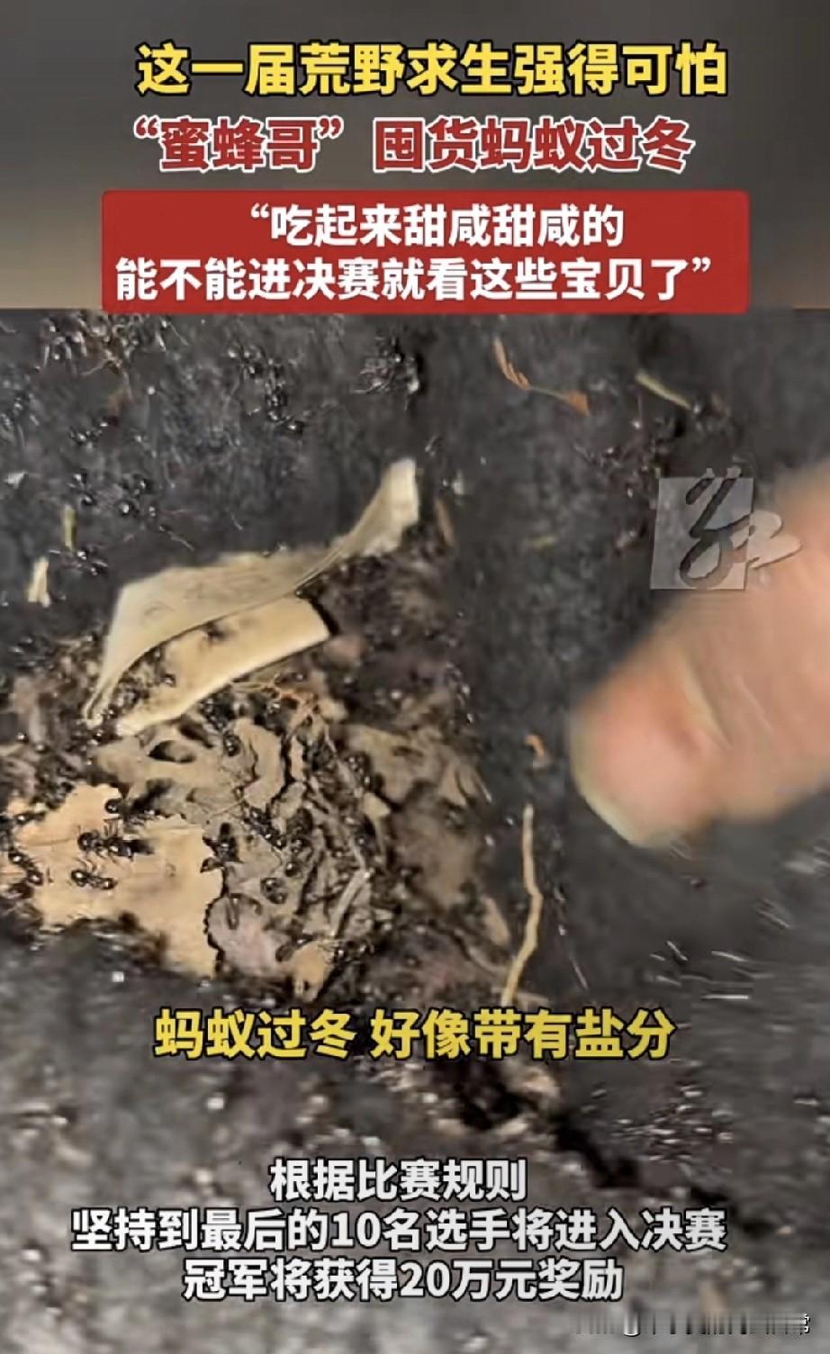 荒野求生玩疯了蜜蜂哥囤蚂蚁过冬! 湖南张家界这届荒野求生选手绝了!“蜜蜂哥”符民乐在七星山荒野求生27天,别人缺盐缺蛋白扛不住,他倒好,直接囤了一大包蚂蚁当“过冬粮”,还说这货吃起来甜咸甜咸的,能不能进决赛就靠它了! 要知道这比赛冠军能拿20万,闯决赛还额外奖2万!可这蚂蚁看着就瘆人,甜咸口更是颠覆认知。有人觉得这是狠人操作,为了奖金拼了;也有人吐槽:这吃法也太野了,真能咽得下去? 你觉得“蜜蜂哥”靠这包蚂蚁能闯进决赛不?换你在荒野,敢吃蚂蚁不?