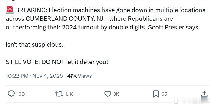 据斯科特·普雷斯勒表示,新泽西州坎伯兰县(Cumberland County)多个投票点的选举机器出现故障——而该地区的共和党投票率比2024年高出两位数。
