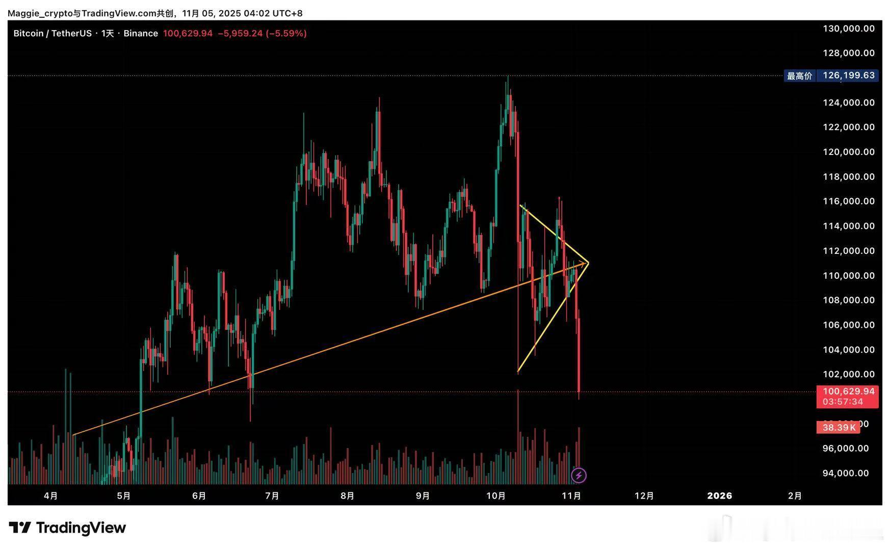 大饼收不回去黑天鹅那根针上方还是不能开哆,下一个支撑9,7W,来嘛,继续跌吧,现