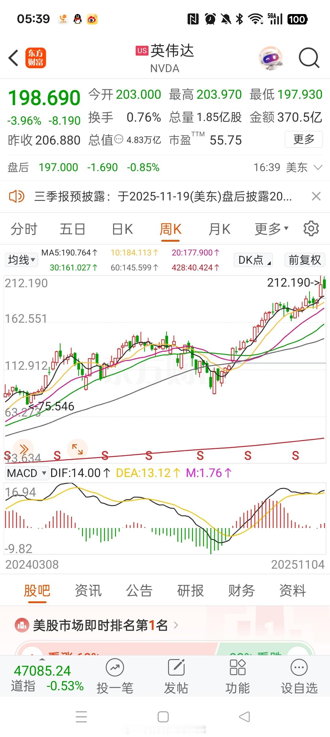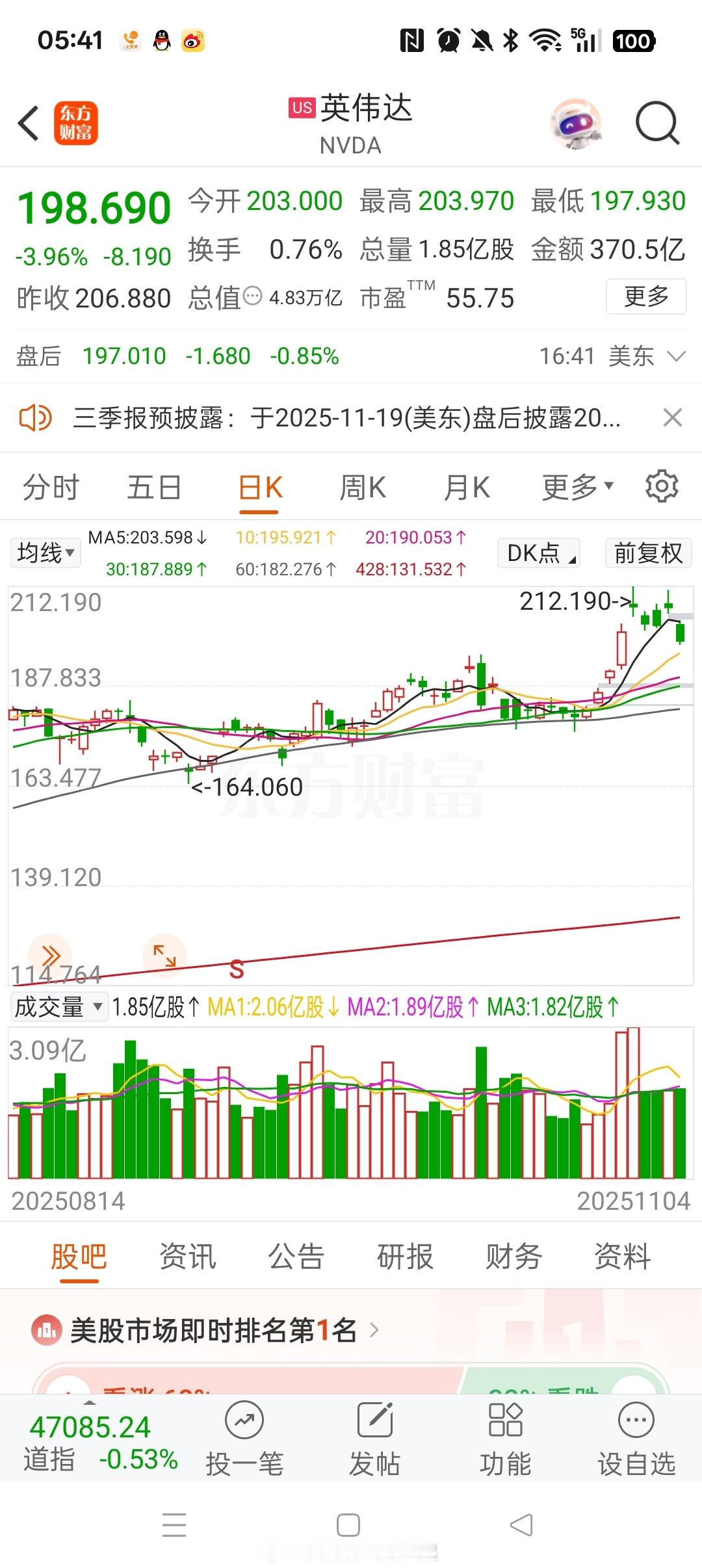 全球科技股总龙头英伟达 NVDA[股票]再次跌回200以内,前几天韩国大单都是高开低走,连续5天阴线,该考虑风险了。