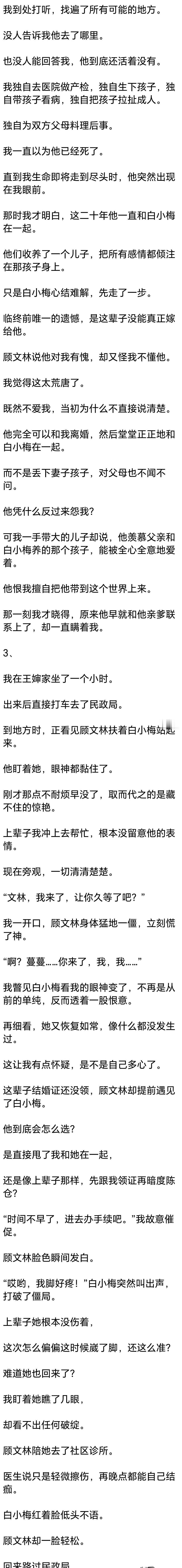 20年。 人快不行了,那个当年一听说她怀孕就跟着白月光私奔的男人,终于回来了。 他看着白月光的遗照,问床上快断气的她:“你说,当初我要是晚点跟你领证,结果会不会不一样?” 我当时听到这个故事,头皮都麻了。 真的,我见过渣的,没见过这么“清新脱俗”的。 这根本不是爱不爱的问题了,也不是出轨不出轨的问题了。 这是一个人的良心,能黑到什么程度的问题。 她怀着你的孩子,一个人熬了二十年,整个人生都被你按下了暂停键,硬生生活成了一部黑白默片。 你呢? 你风流快活完了,回来对着她的临终遗言,还在回味你自己的“青春疼痛文学”? 你不是在问她,你是在问自己。 你不是在忏悔,你是在遗憾——遗憾自己当初没能更“完美”地甩掉她。 哥们,你是在用她的命,给你那死去的爱情,烧的最后一炷香啊。 所以说,有些东西,真的不能叫“人”。 他只是长了个人样。 如果真有重来一次的机会,拖延领证都算是仁慈了。 直接让他滚,滚得越远越好。 垃圾就该在过期前,就扔进垃圾桶里。 别等他发臭,熏了自己半辈子。