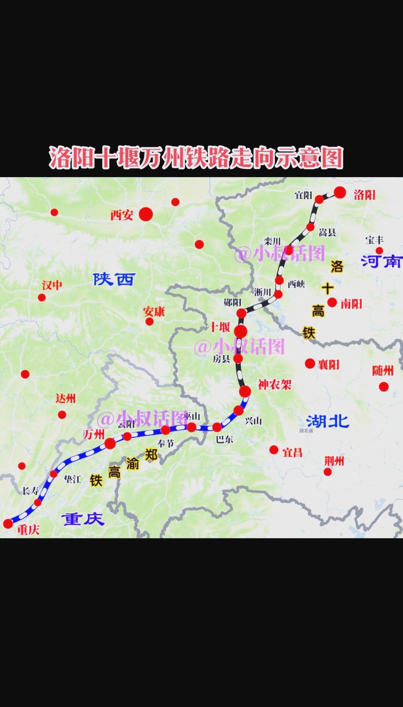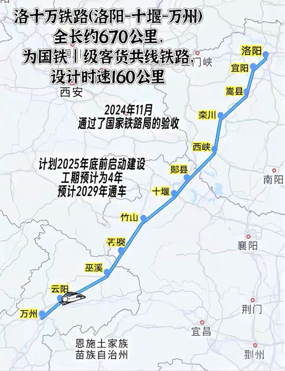 洛十万高铁规划 洛十万铁路(洛阳至十堰至万州铁路)是一条连接河南、湖北、重庆三省市的重要铁路项目,目前正处于前期推进阶段。 ‌ 起点为洛阳东站,经河南嵩县、栾川、西峡,湖北十堰、竹山、竹溪,重庆巫溪、奉节、云阳,终点至万州,全长约670公里‌。国铁Ⅰ级客货共线铁路,设计时速160公里/小时‌。 ‌填补豫西、鄂西北与渝东北地区路网空白,串联老君山、武当山等5A级景区,兼具旅游与货运价值‌。 ‌河南段‌:洛阳东站(特等)、嵩县站(四等)、栾川站(三等)、西峡站(四等)‌。 ‌湖北段‌:十堰市(地级节点)、竹山、竹溪‌。 ‌重庆段‌:巫溪(途经未明确设站)、奉节竹园镇(已规划)、云阳、万州,远期延伸至忠县、丰都、涪陵,终点重庆东站‌。 ‌建设难点‌需穿越伏牛山等复杂地形,投资与效益平衡是审批关键‌。 ‌ 沿线旅游资源超丰富,有8个5A级、37个4A级景区,像老君山、武当山等。在旅游经济发展当下,高铁能给游客舒适快捷的旅游体验,还能带动多个行业。而且国内不少旅游城市都在为旅游建高铁,所以洛十万铁路建高铁也很有必要。若建成,十堰将形成“五向高铁、四向普铁”枢纽,成为鄂豫陕最大铁路枢纽‌。