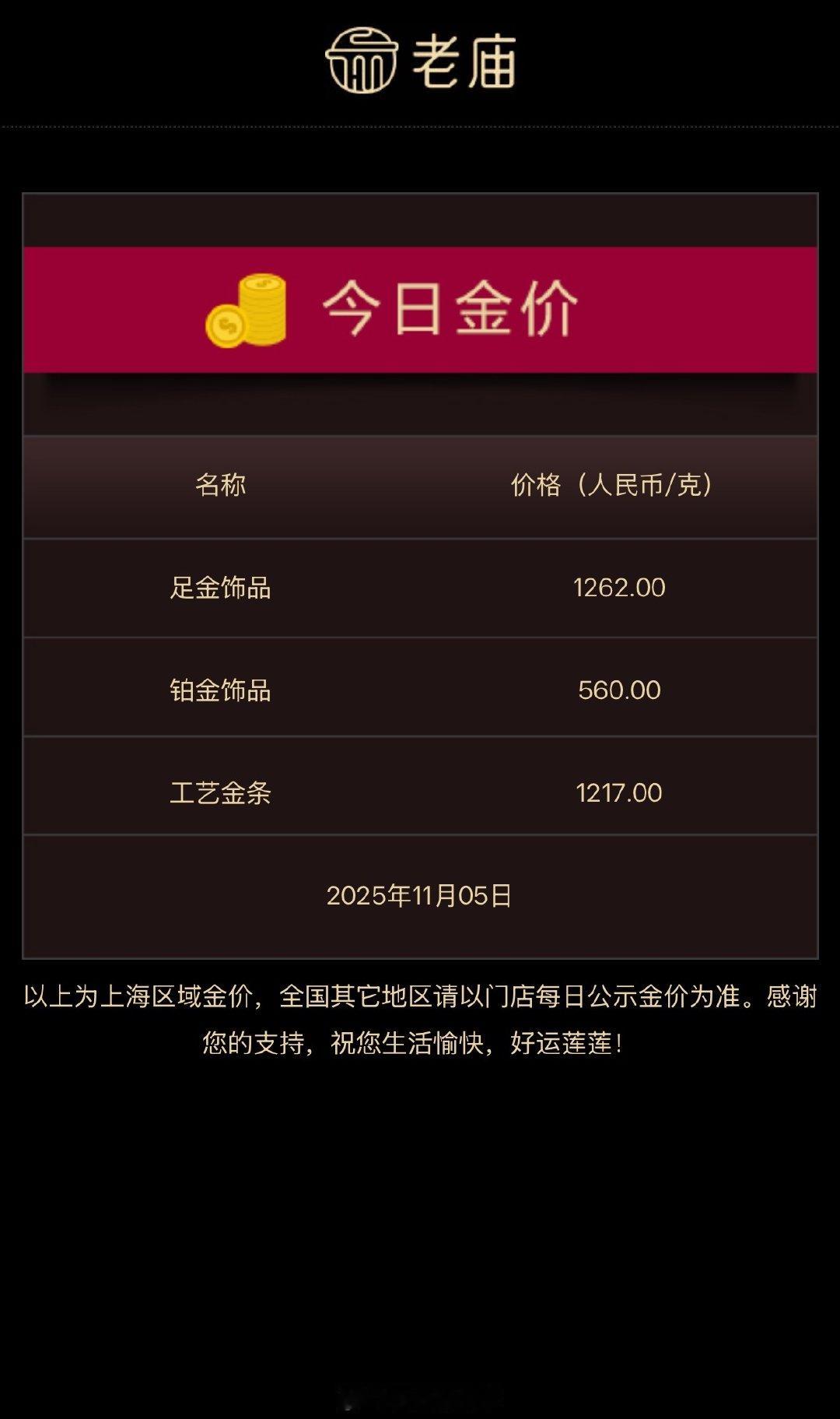 11月5日早间,老庙黄金昨日足金饰品报价1187元/克,今日足金饰品报价1262元/克,较昨日上涨75元/克。金价
