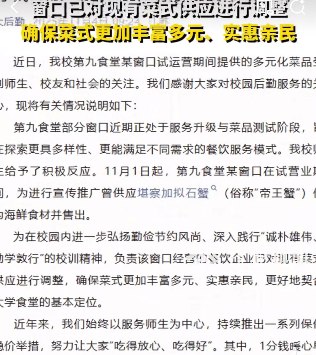 南大食堂最近整了个大新闻,居然开始卖999块的帝王蟹了!这事儿在网上直接炸开锅。 有人说这是贴心服务,满足不同学生需求;也有人骂纯粹是跑偏了,大学食堂搞这么高档干啥。要我说啊,这事儿得掰开看。 其实这只帝王蟹重四斤二两,算下来比盒马还便宜点。而且人家档口也不是只卖贵的,同时还有10块钱的生蚝、40块一斤的虾,选择挺多。有意思的是,买帝王蟹的学生大多是几个人凑钱拼一只,人均两百多尝个鲜,还有人晒图说味道确实不错。 但反对的声音也不是没道理。现在大学生一个月生活费普遍就一千七八,一只螃蟹干掉半个月生活费,确实有点夸张。再说了,食堂花的都是学校资源,主要任务应该是让所有学生都能吃上实惠可口的饭菜,而不是去满足少数人的高端需求。 大学食堂嘛,说到底是个服务学生的地方。就像宿舍有四人间也有两人间,饭菜也可以有不同档次。但最关键的底线是得保证基本伙食——那些七八块钱能吃饱的套餐、几毛钱的素菜必须管够管好。在这个基础上,适当搞点高端菜品当补充,倒也不是不行。 现在南大食堂已经调整了菜品,这个反应还是挺及时的。其实大家吵来吵去,核心就一点:高校服务既不能一成不变,也不能忘了本。守住平价实惠的底线,同时适当满足多元化需求,这个平衡点找到了,事儿也就办好了。