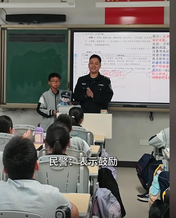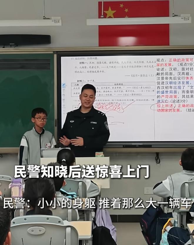近日,台州路桥,中学生们正在上课时,突然有位民警来到了班级中,将一名男生点名叫到讲台前,男生以为自己做错事了,没想到民警同志后面的一句话,竟让全班同学都触动了,给男生送上了热烈的掌声。 原来,就在前几天,民警同志下班时,看见路边有个环卫工人正在推着车子艰难的往起走,民警看出应该会是有一处车轮胎坏了,导致工人只能推车行走,就在民警同志想要过去帮忙时,突然一灰色的身影抢先一步来打了环卫工人身边一起推车。 民警发现这是名穿着校服的男生,男生跟车主说了一声之后,就跑到车后面,用力推着车子往前走,尽管自己没那么大的力量,但男生一直没有放弃,直到把工人送到了地方后再走。 民警看到这一幕也触动,小小的身躯推着那么大一辆车,这需要的不仅是体力,更是意志力和爱心,民警觉得不能让男生的善行白费,就根据校服的特征,来到了男生的学校,仔细辨认后确认了男生的班级,把男生叫到讲台前,跟同学们说了男生的事迹,并且送上了公安的宣传玩偶作为奖励,台下瞬间想起了一阵掌声,为同学的善行鼓掌。 男生看着手中的玩偶和台下为自己鼓掌的同学们,眼眶也湿润了,没想到自己一件随意的小事,竟然能有这么大的回报,这下在全校都要出名了。 对孩子的家长来说,以后孩子的成绩已经不重要了,因为自己的孩子已经成为了一个有爱心的人,并且成为了别人的榜样。 就像有网友说的:优秀的孩子。好有爱心,要大力宣传。 我们对孩子的教育,不应该只注重学习成绩的考核上,更应该注重孩子的一言一行,教育孩子成一个好人,而不是成为只有学历没有素质的恶人,男生主动帮忙推车的那一刻,就是教育最大的意义,对身边善行的宣传,就是我们最好的教育。 素材来源:台州公安