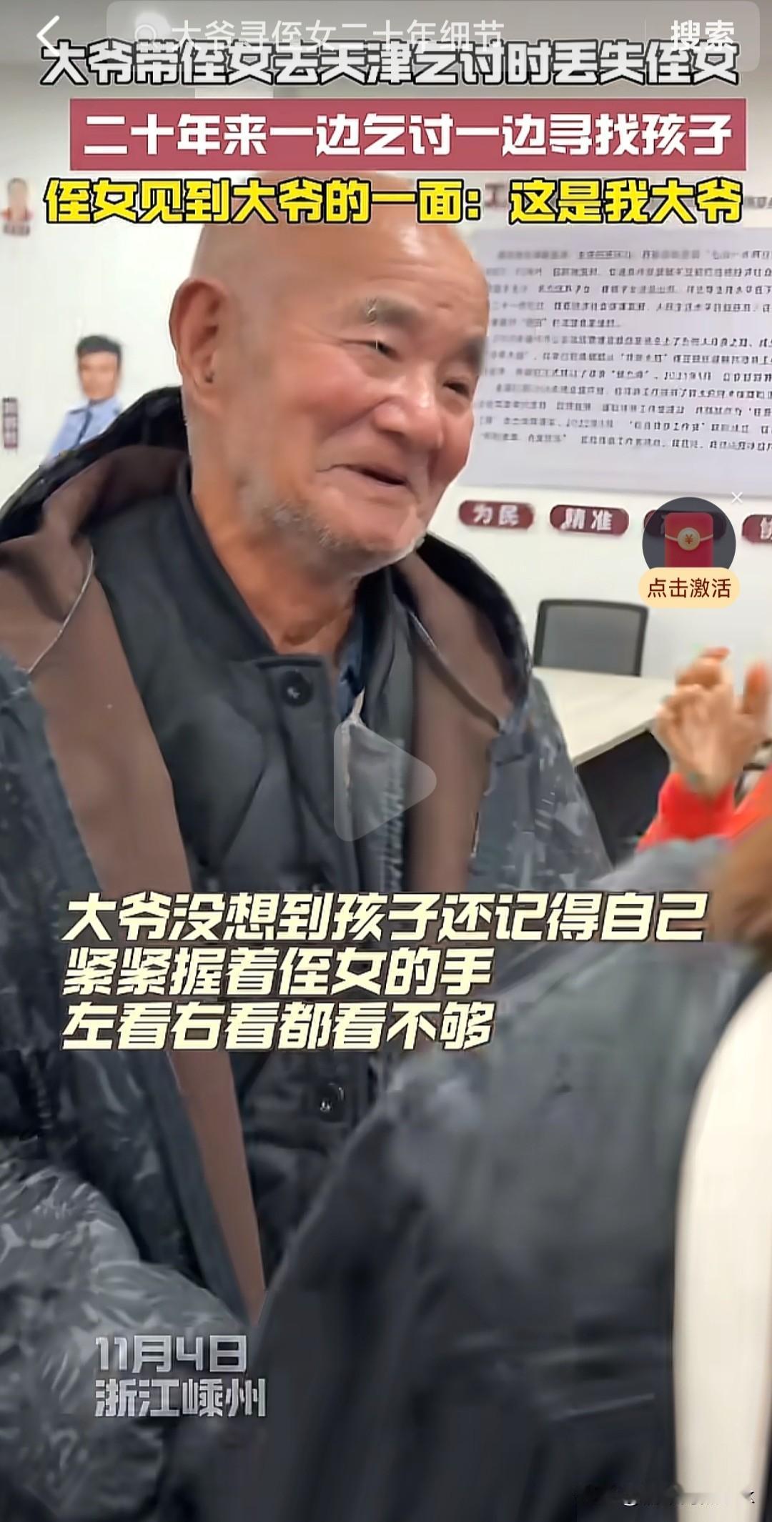 泪奔!再穷也要回家!被拐21年的女孩一眼认出了带他乞讨的大爷,大爷四度欲下跪感谢商警官,20多年,大爷一边乞讨一边寻女终于圆满画上句号。 11月4日,一场认亲会在商警官的操持下在浙江嵊州举行。双方见面前,商警官给被拐21年的女孩说,她的家庭有点特殊,她是家里最小的女儿,生下来后就过继给了未成家无儿无女的大爷(父亲的哥哥),当年大爷带着6岁的她到天律乞讨为生,开始是住在亲戚家的废品站,后来废品站住不下,大爷带着她住到了桥下,有天早上醒来,发现女孩被人抱走了,从此大爷踏上了边乞讨边找孩子的行程。 女孩难过地说,难怪我的印象中没有父母的影子。 另一边,在认亲大厅,大爷紧紧地握住商警官的手,不停地说谢谢,四度欲弯腰下跪感谢,被商警官紧紧扶住,这一刻大爷盼了21年,也内疚了21年。 当看到商警官带着侄女缓缓而来,大爷努力地控制着将决堤的泪水,将脸偏向一边,不敢看。 女孩老远就激动地指着前方,“我大爷!这是我大爷啊!我认出我大爷了!” 女孩边指着前方,边激动地掩嘴笑着,一句句重复着“我大爷”,估计自己也感到神奇,6岁时的模糊印象在这一刻却是如此的具象化。 女孩上前紧紧抓住大爷干枯的手,四目相对,都控制不住泪流。 旁边的拄着拐杖的妈妈也哭了,急不可耐的拉过女儿,问记得爸爸妈妈吗?记得哥哥哥姐姐吗? 女孩说,没有印象,不记得了。 但她的目光始终没从大爷身上离开。 大爷心疼地问,还记得我带你乞讨住桥洞吗? 女孩说,记得。大爷抺着泪,仔细地端详着侄女,既高兴又心疼,这么多年,他边乞讨边找寻侄女,老天还是挺眷顾他的。 再穷也要回家,女孩知道家境不好,还是义无反顾地踏上寻亲之路,大爷一直没放弃寻找,他肯定非常爱侄女,才有这美好的团圆。 女孩看起来应该过得不错,手上戴着做工精美的指甲,肯定是个活得精致的女孩,大家都祝福她。 在痛恨人贩子的同时,网友们更希望侄女好好爱大爷,照顾大爷,他这21年受了太多苦,看得出,侄女一直是他的精神支柱,是他的世界,他也给了侄女全部的爱。 愿天下无拐,愿每个被拐的孩子能鼓起勇气寻找回家之路,一滴血的距离,别让家人等太久,别给人生留遗憾!