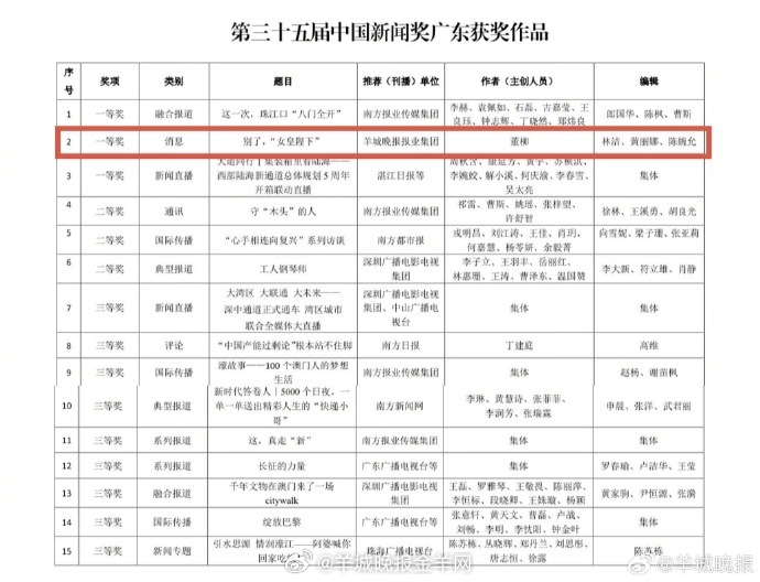 据悉,过去一年广东省新闻舆论工作取得丰硕成果。在第35届中国新闻奖评选中,广东省15件作品获奖,包括一等奖3件、二等奖3件、三等奖9件,创历史最好成绩。其中,羊城晚报报业集团消息《别了,“女皇陛下”》获评第35届中国新闻奖一等奖。在全国新闻界第十二届“好记者讲好故事”活动中,羊城晚报报业集团的沈婷婷、高镛舒等7位记者获“优秀选手”称号。
