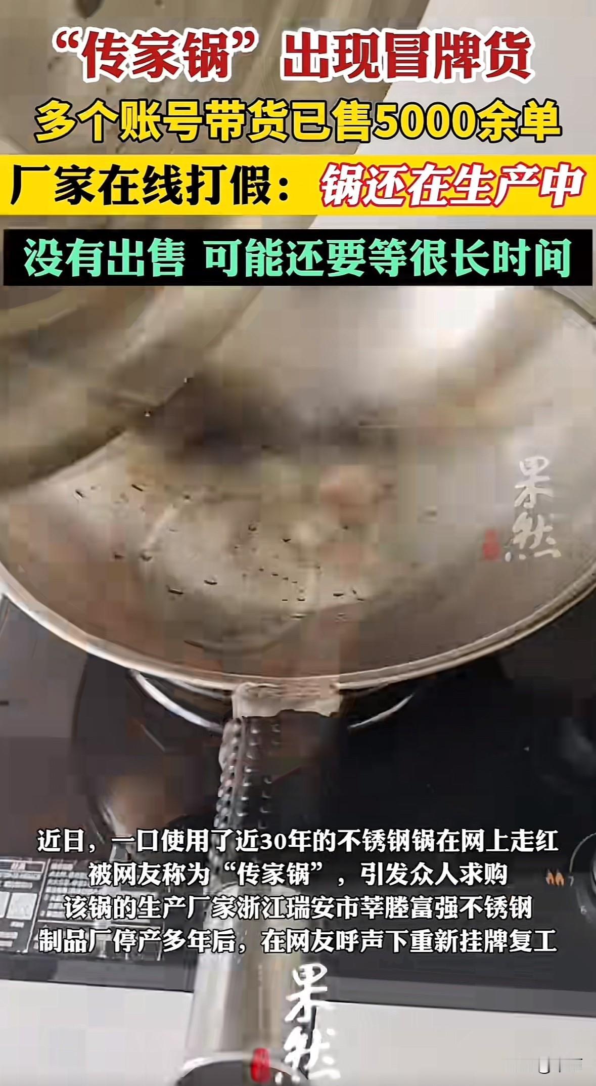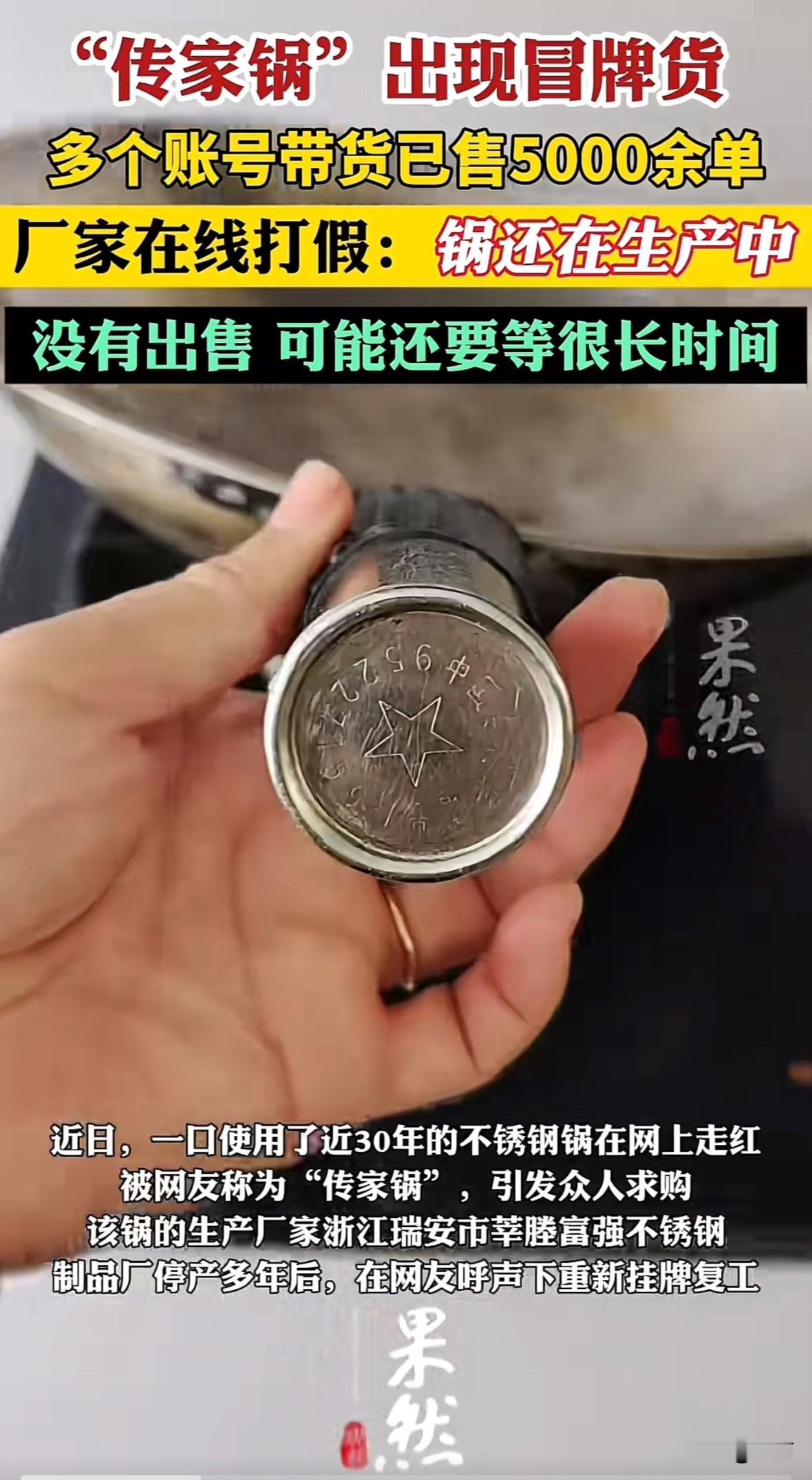 浙江瑞安“传家锅”因能用几十年走红,停产老厂复工复产。正品还没开售,网上就有直播间盗视频冒充厂家,卖起冒牌货,销量超5000单。 厂家老板紧急打假,说正品没授权任何人,唯一商标是“汇十方”,只靠瑞安融媒独家卖。正品锅底3毫米厚、有专属编码,现在还在赶工。 冒牌货已经下架,官方也联合打假了。网友想要耐用好货才追捧“传家锅”,假货坑人又毁品牌。 买东西得认准官方渠道,别被低价忽悠。支持匠人守品质,也盼打假能更严,不让好口碑被假货糟蹋。