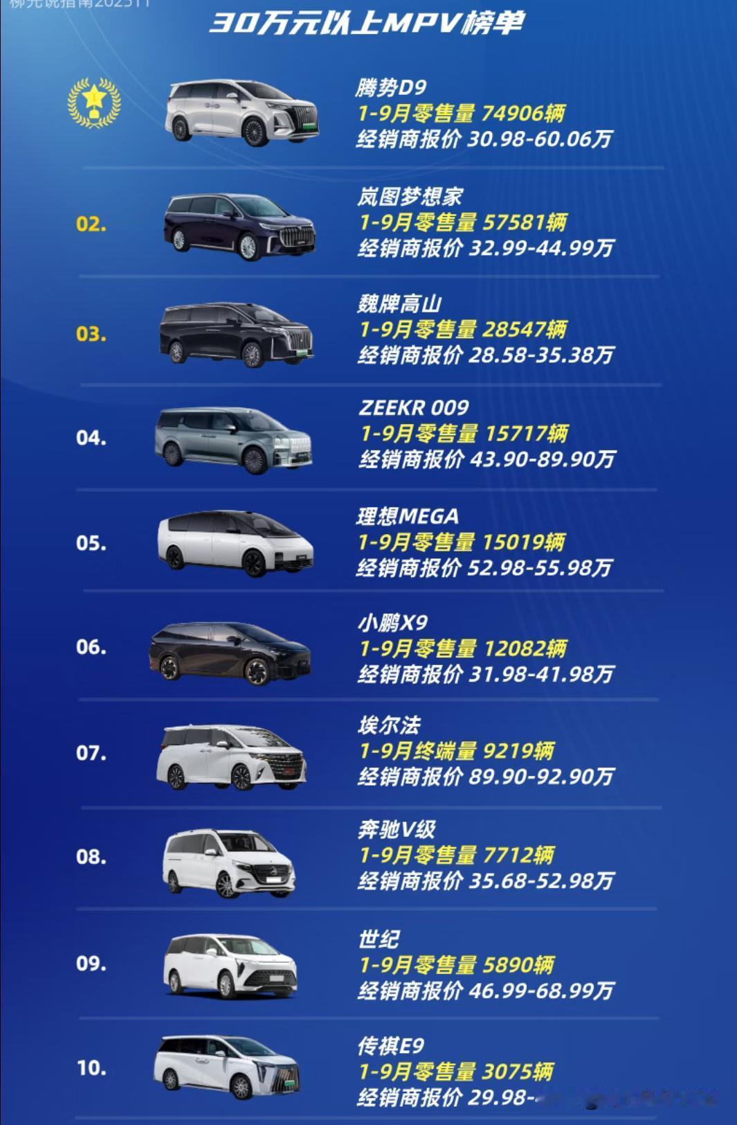 高端MPV榜单 30万元以上MPV 第十名:传祺E9 第九名:世纪 第八名:奔驰V级 第七名:埃尔法 第六名:小鹏X9 第五名:理想MEGA 第四名:ZEEKR 009 第三名:魏牌高山 第二名:岚图梦想家 第一名:腾势D9 MPV 排在榜首位置的腾势D9,今年1-9月累计零售量达到74906辆。