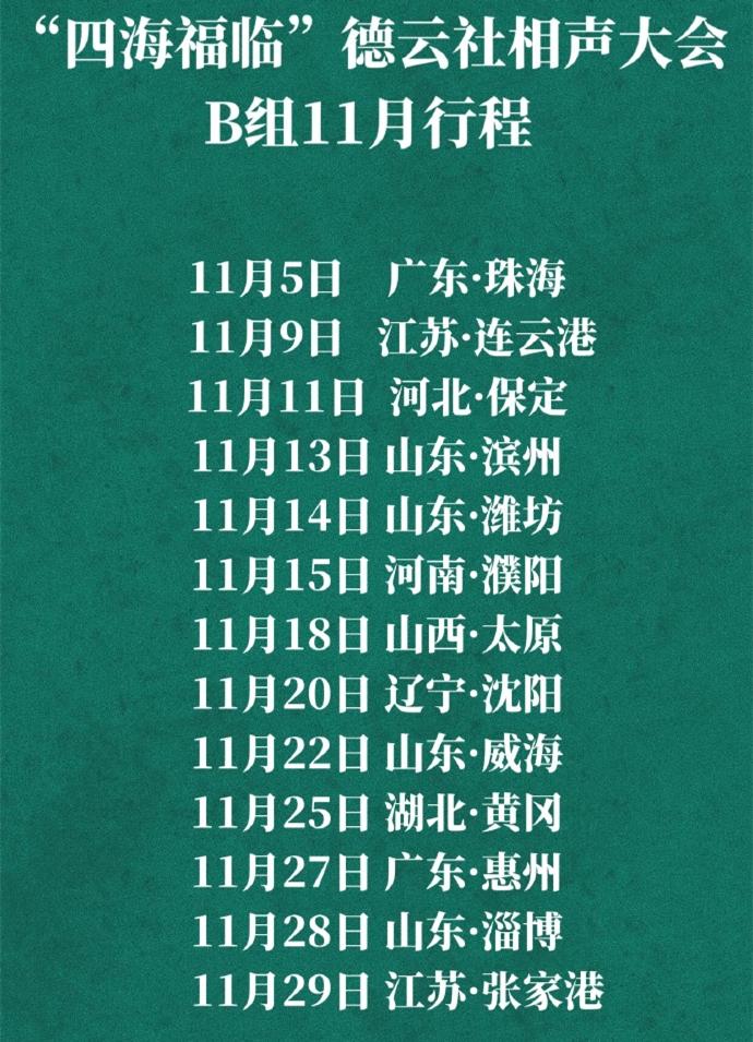 德云社相声大会B组的巡演行程安排来了!10月份,A组20天演出14场。进入11月份,该B组发力了,25天演出13场,去了山东、广东、江苏、河北、河南、山西、辽宁、湖北这八个省。演出城市包含省会城市,一二线城市和三四线城市。其中,在山东演出四场,在广东、江苏分别两场,其余五个省分别一场。
