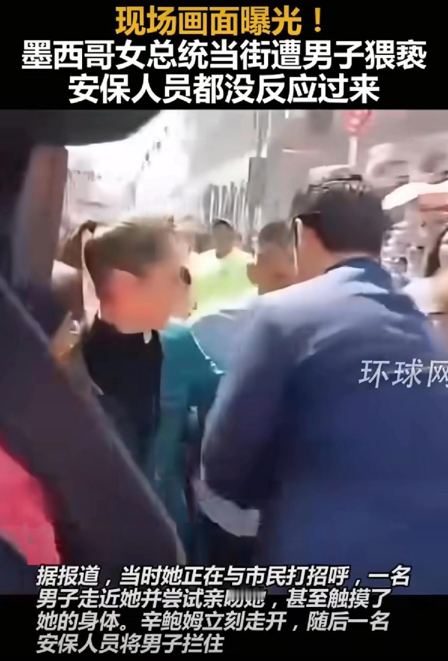 墨西哥女总统当街遇性骚扰,光天化日安保形同虚设! 事情发生在11月4日墨西哥城,克劳迪娅·辛鲍姆正和市民打招呼,一名男子突然从背后搂肩强吻,手还往胸部伸。 全程安保反应慢了半拍,看得人血压飙升。 更扎心的是,这已不是偶然。这月初有市长在亡灵节被枪杀,六月还有女市长在办公室遇害。墨西哥平均每天近10名女性死于性别暴力,但定罪率才2%。 连总统都护不住自己,普通女性怎么办? 辛鲍姆事后冷静得让人心疼,只强调“公共安全是公民权利”。可光有态度不够,墨西哥毒贩人数比警察还多,司法腐败、经济困局,都是硬骨头。 说到底,这次袭击不光是安保打脸,更是整个社会治理的缩影。 如果连总统的尊严都守不住,谈何保护每个普通人?希望这一记耳光,能真正打醒变革。