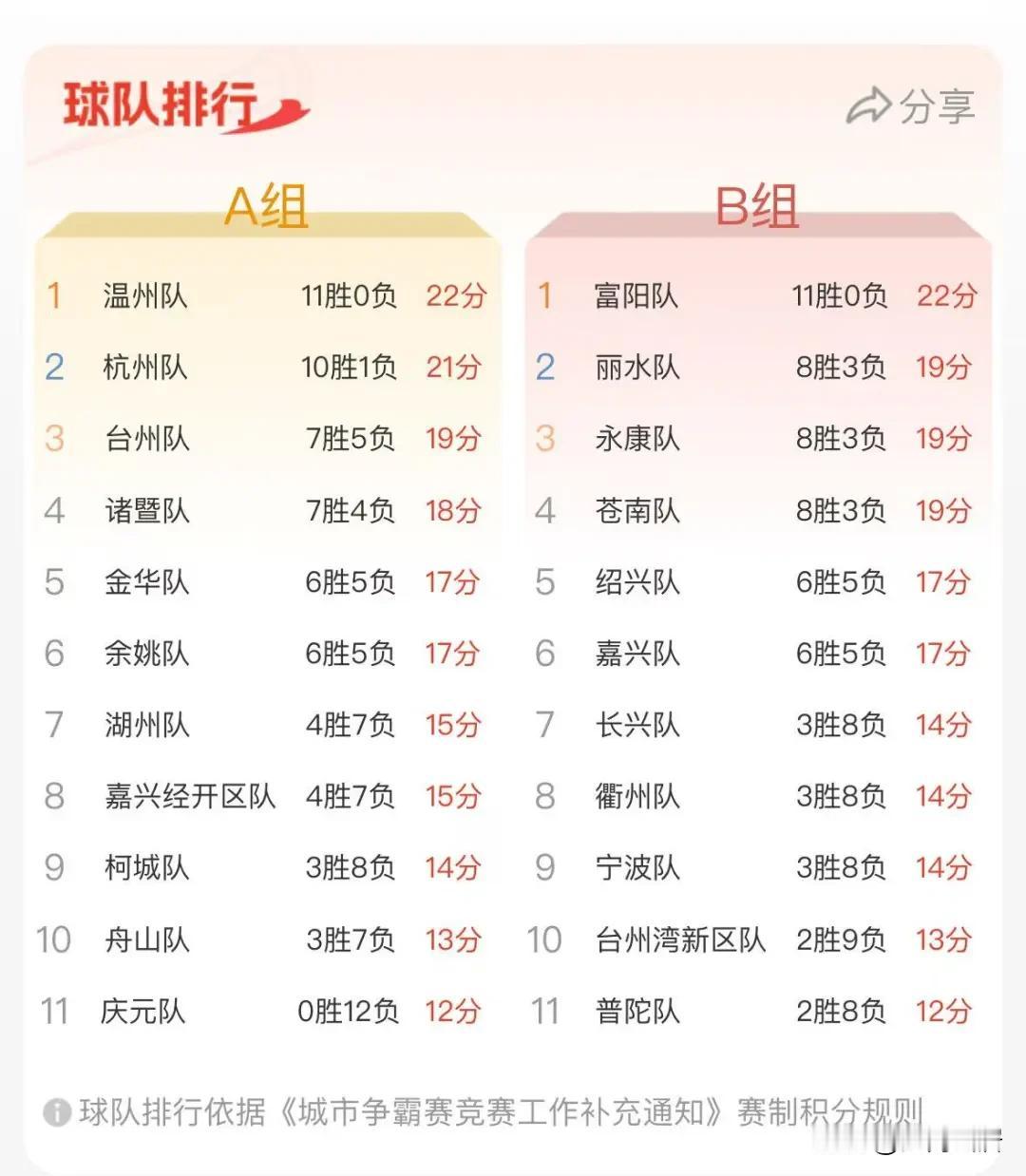 昨晚的浙Ba联赛,台州队客场,对阵庆元队,并赢得了比赛。截止目前,台州队的积分排名,已经升至a组第三名。目前温州队,富阳队,仍然以11胜0负的战绩,领跑小组赛。杭州队以10胜1负,居a组第二名。b组方面,丽水队,永康队,苍南队,均是8胜3负,竞争比较激烈。最终a组和b组,哪些球队,能够小组赛出线,目前还有很大的悬念!