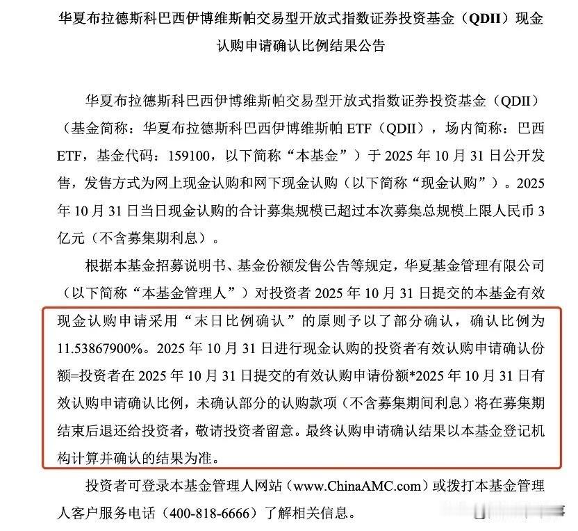 太疯了!! 巴西ETF一天被抢空,10万只配1万多 家人们,这波外资行情也太火了!国内首批2只巴西ETF刚一发售,直接被资金“抢疯”了,仅卖一天就宣告售罄,还触发了超低比例配售 。 11月4日晚间,两家基金公司陆续晒出结果:易方达巴西ETF的确认比例只有11.823%,华夏巴西ETF更夸张,低至11.538679%。这意味着啥?要是你投了10万块,最后到手的还不到1.2万,剩下的钱全得退回来,不少投资者都在平台上喊“根本买不够” 。 要知道,这两只基金原本募集上限都是3亿,结果一天之内,华夏单只就吸引了约26亿资金,两只加起来超募足足7倍多,创下2022年以来新基金认购的最低配售纪录。 为啥巴西ETF突然成了“香饽饽”?其实早有信号。今年以来巴西基准股指Ibovespa累计涨了约24%,过去十年年化收益超12%,而且成分股里全是淡水河谷、巴西石油这类全球资源巨头,跟国际大宗商品行情紧密挂钩。加上美联储降息后,全球资金在找高收益去处,巴西的高利率和稳健基本面,成了新兴市场里的“香饽饽”,上半年外资净流入就达269亿雷亚尔。 还有不少投资者盯上了套利机会,毕竟现在QDII额度紧张,大家都猜上市首日可能会溢价卖出。不过也得提醒一句,虽然眼下行情热闹,但巴西股市受全球流动性和财政政策影响不小,想进场还得多留个心眼。 这抢筹的架势,足以看出大家对新兴市场的热情了!你抢到这波巴西ETF了吗?