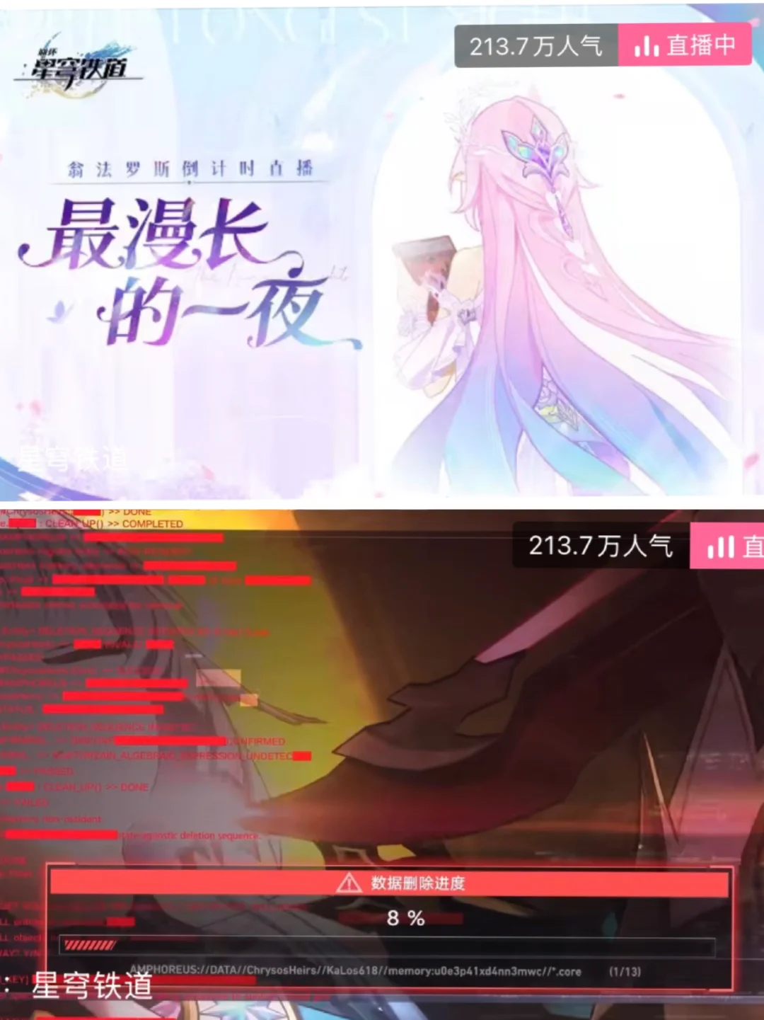 崩铁今天晚上开始了3.7版本预热直播,直播的内容是回放3.0以来公布的视频的同时,在视频前段挂上一个删除数据的进程。