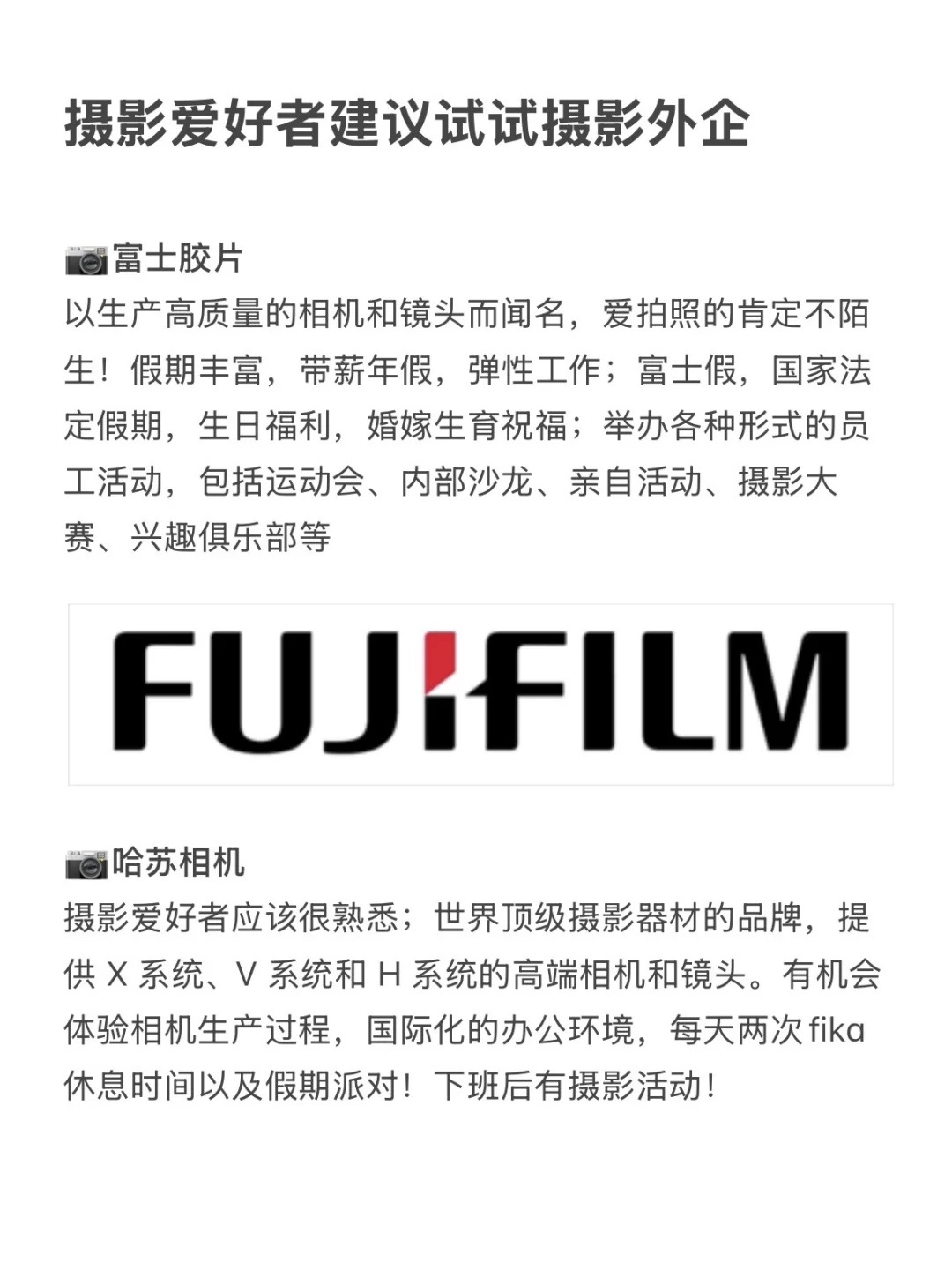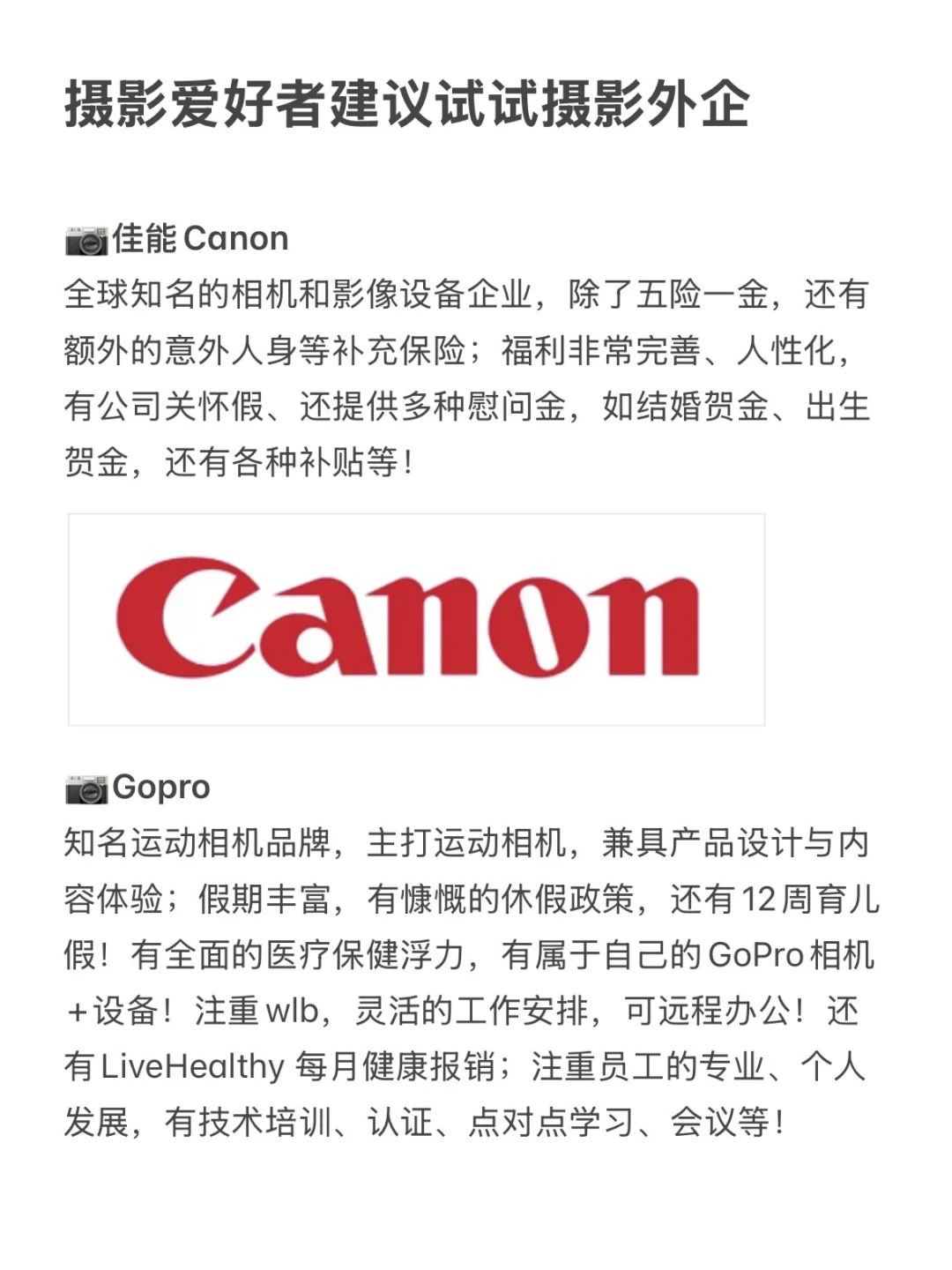 摄影行业热度一直没掉,相机从单反到微单爆火,运动摄影+无人机也越来越专业;真心建议喜欢摄影的可以大胆去尝试摄影外企! · 为什么建议试试摄影外企? ▪️工作日常就是和相机、镜头、创意大片打交道,同事全是同类,聊构图、聊灯光,灵感根本停不下来 ▪️双休+灵活居家办公,不卷不加班,年假15天起,对女生超友好 ▪️内部买相机/镜头/胶卷全是员工价,福利多到像在薅羊毛 ▪️岗位超多,摄影师、后期、媒介、市场..零基础也能投 · ✊坚持日更,帮大家在找工作路上顺利拿到offer! .
