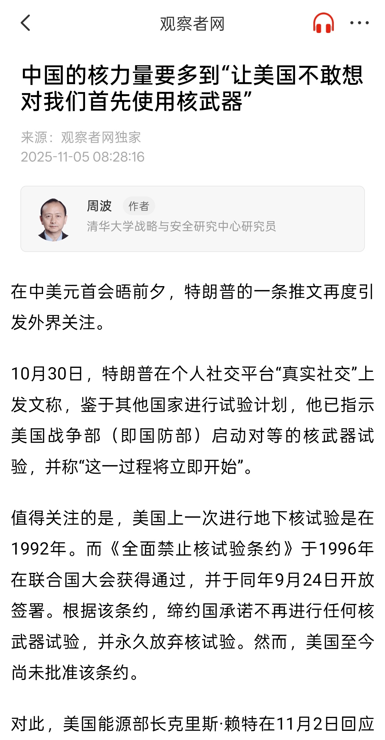 周波:中国的核力量要多到“让美国不敢想对我们首先使用核武器”美国国防部副部长埃尔