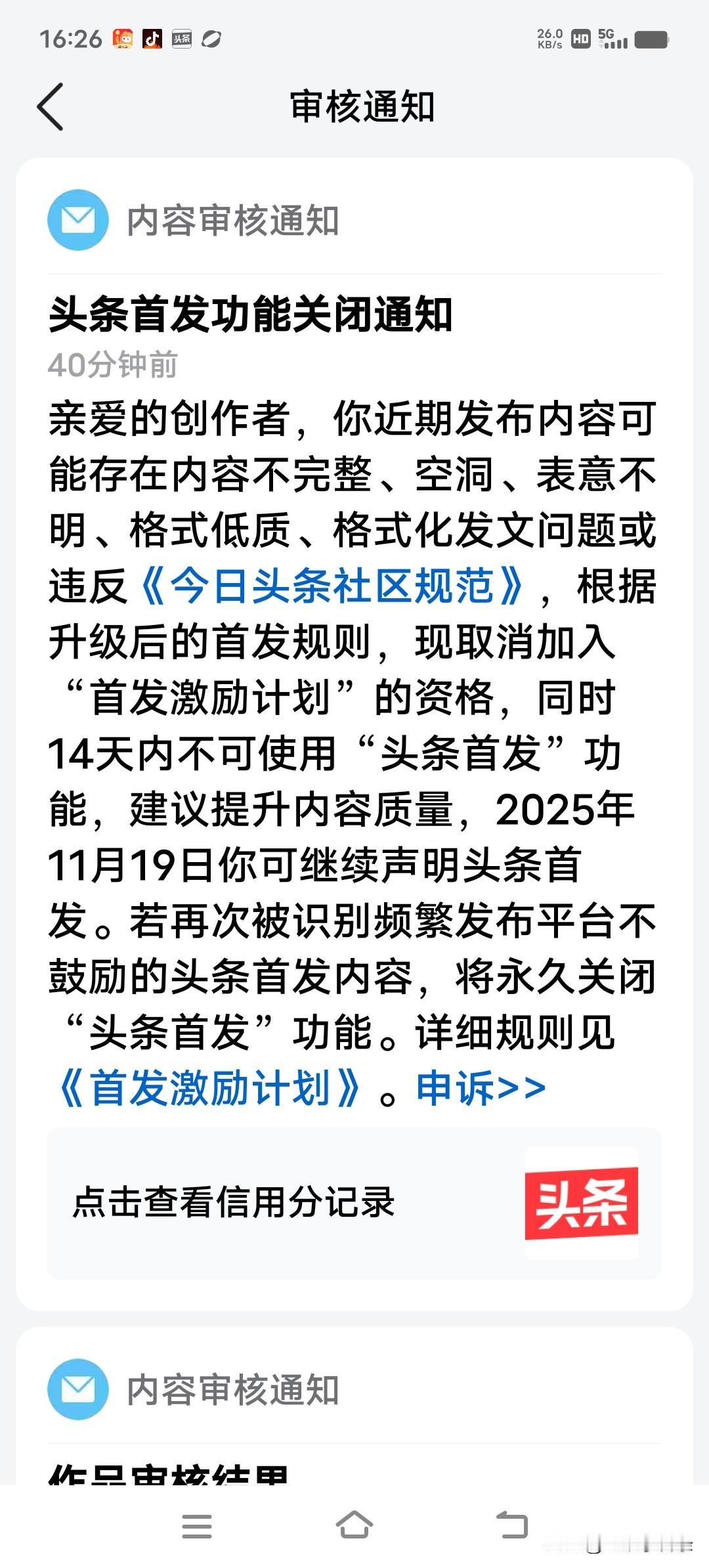 不愿意看到的一幕今天看到了,今天头条取消了我的首发激励资格,说是意料之外,其实也是意料之中。 前两天我看到一个动图,很有感触,我觉得应该写一篇微头条让更多的人看到,引起注意。 这篇微头条发出去以后,反响不错,很多人阅读、评论,因为最近流量不好,我很珍惜这个作品,心里也有隐隐的不安,因为我知道,一旦有作品阅读量高了,往往就会接到违规通知。 果然不出我的所料,刚刚推的好好的作品,正在既高兴又担忧的时候,头条发来通知,说我违规了,违规的原因也是匪夷所思。 尽管想到了,不理解,我还是对作品做了修改,再三强调这是以前发生的事情,之所以发出来是让大家注意安全,引以为鉴。 我也知道修改无济于事,果然,修改了三次都没有通过,我也没在意,我知道这个作品就这样夭折了。 但是今天,我就收到了头条的通知,取消我的首发激励计划的资格,我不觉得突然,因为我最近参加了头条小秘书的一个邀请,当周阅读量超过一万就会有66元的奖励,每当我参加活动的时候,就会流量低迷,就会收到违规的通知,就会取消资格。 既然都想到了,就没有什么好惊讶的了,头条从来都是按套路出牌。