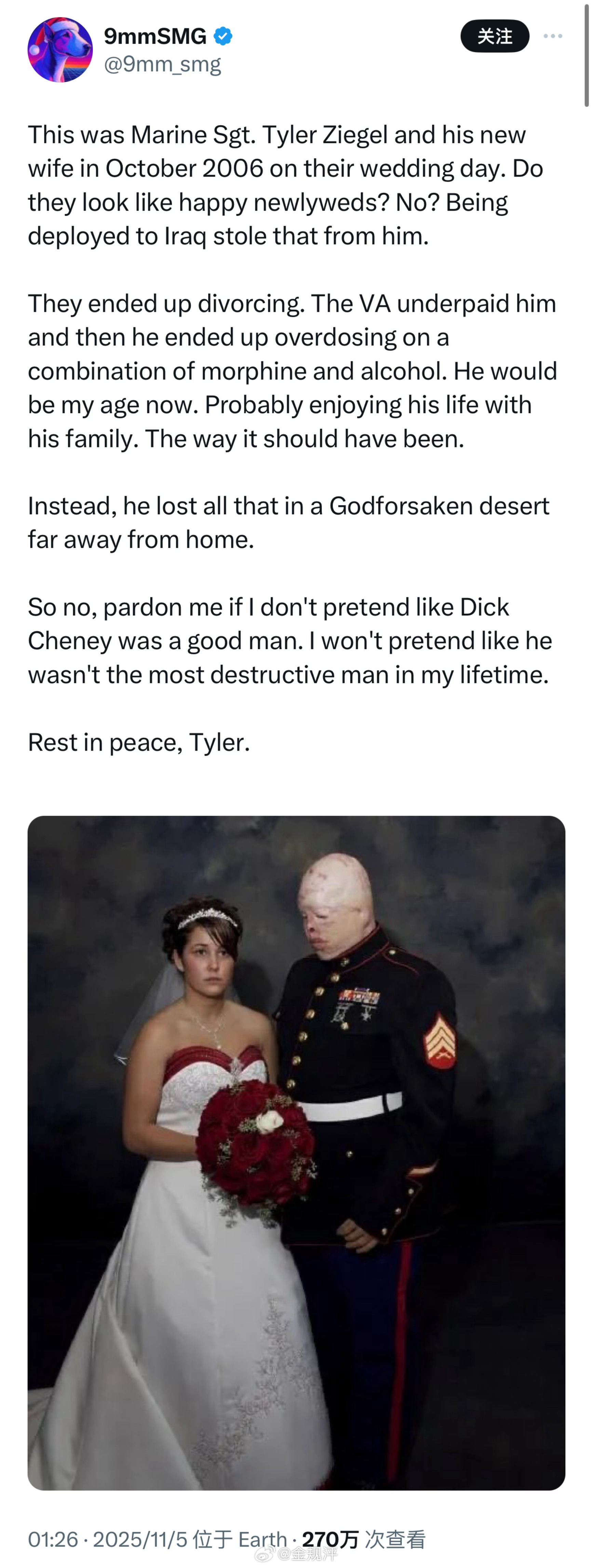 “这是2006年10月,海军陆战队中士Tyler Ziegel和他妻子的婚礼照片。他们看起来像一对幸福的新婚夫妇吗?肯定不像,他被派往伊拉克之后什么都没有了。