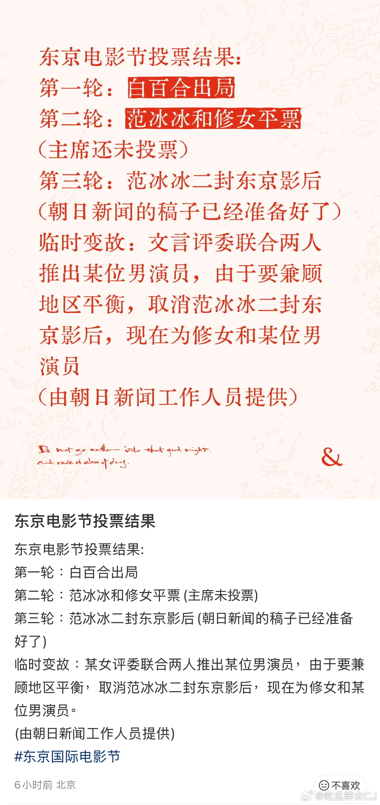 但现在能像金马一样在颁布提名或者正式颁奖后给出评审讨论细节和进度,或者像今年欧三大颁奖后部分评审站出来对于作品胜出做简单论述的还是很少,大家看奖项归属自然是不理解不明白,也就会放大那些看来抓马的猜测。而东京电影节去年甚至是连颁奖前后的媒体记者会都没开,评审们后来再也没提过这当中的任何,今年又有两位颇受关注的女演员发博表达了自己的态度,网友们展开各种想象也很正常。