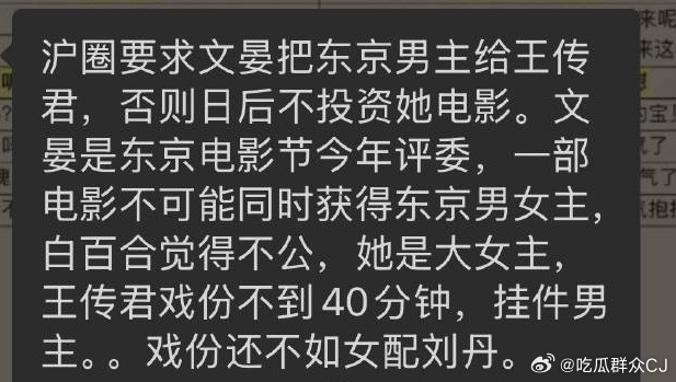 东京电影节很快就要开始颁奖了,但白百何和范冰冰接连回国并发出不甘或自我鼓励的文字,都让网友对她们没能得奖这件事展开无限想象。白百何发博后出现一个爆料,说沪圈要求文晏让王传君拿奖,不惜牺牲女主角拿奖的可能性,《地母》剧组知道没奖后又出现一个所谓朝日新闻工作人员保真的料,说文晏坚决反对范拿奖,还列出了一轮二轮被投出去的细则。王传君 白百何