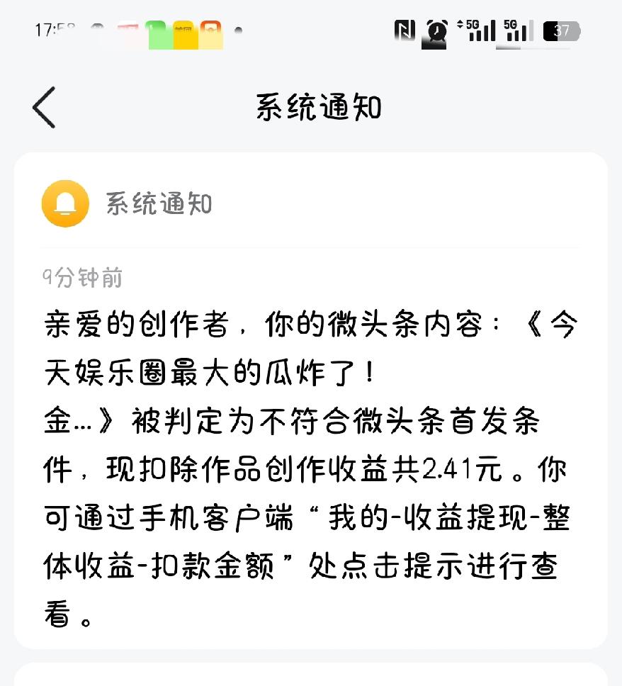 第一次被扣钱 以后还是老老实实搞原创吧 希望能给大家一个警醒 前几天看到一则新闻 觉得很有意思 就给发了出来 两天后头条警告说不是原创 被扣了分 之后我就把它隐藏 忘记删除了 结果今天收到了扣钱的警告 赶紧把它删除了 希望大家能够以此为戒 多多搞原创 不要去照搬抄袭 原创抄袭 原创作者上热搜 违规评论 原创抄袭投诉 原创有收益