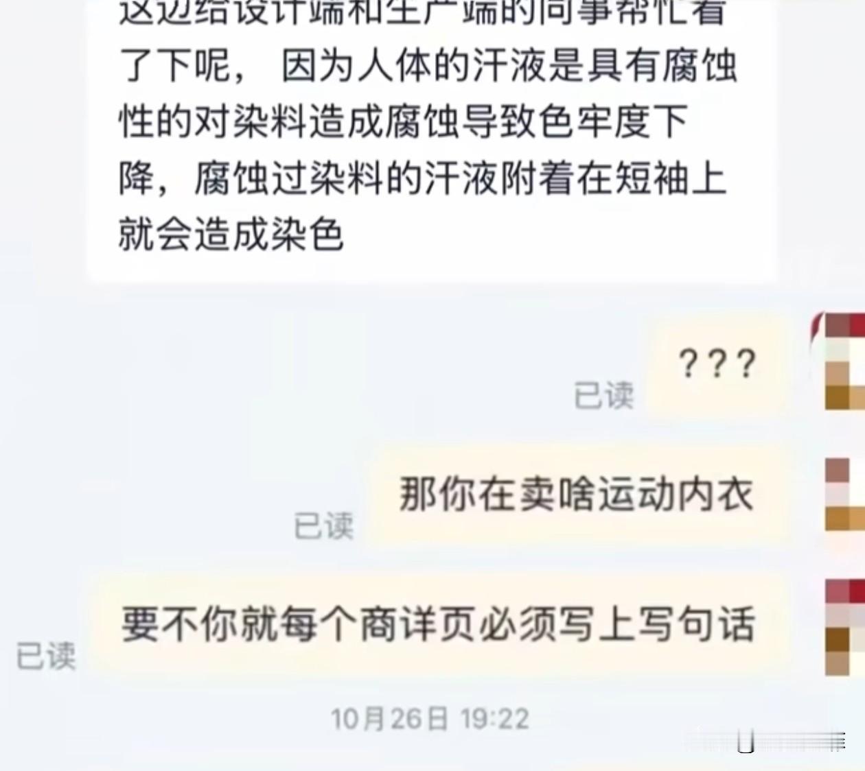 女子花200多在网上买了一件运动内衣,结果穿着跑完越野后严重褪色,将399元的短袖胸部染成了粉色,联系商家希望有解决办法。商家:运动内衣经不起汗液腐蚀。 浙江,女子穿着新买的运动内衣,去跑70公里越野,没想到过程中出汗多,内衣直接褪色了,把穿在外面的短袖胸部染成了粉色,身体上也有染色,费了点劲才洗掉。 这件运动内衣之前只机洗过一次,压根没掉过色,而且商品页面还写着流汗不闷汗,专门适配运动场景。 女子找到商家说明情况,希望能退款并赔偿被染色的短袖,但商家表示汗液有腐蚀性,导致内衣掉色,而且已经过了售后期,只愿意赔偿30元。 后来事情发酵,商家又联系女生,说只要她删掉网上的吐槽帖,就赔偿染色的短袖,好好处理问题。 可女生删了帖之后,商家方直接失联了,那款掉色的运动内衣还在平台正常卖。 现在女生打算找消费者协会维权,而商家目前只说要问问产品部门,还没给出新的解决方案。