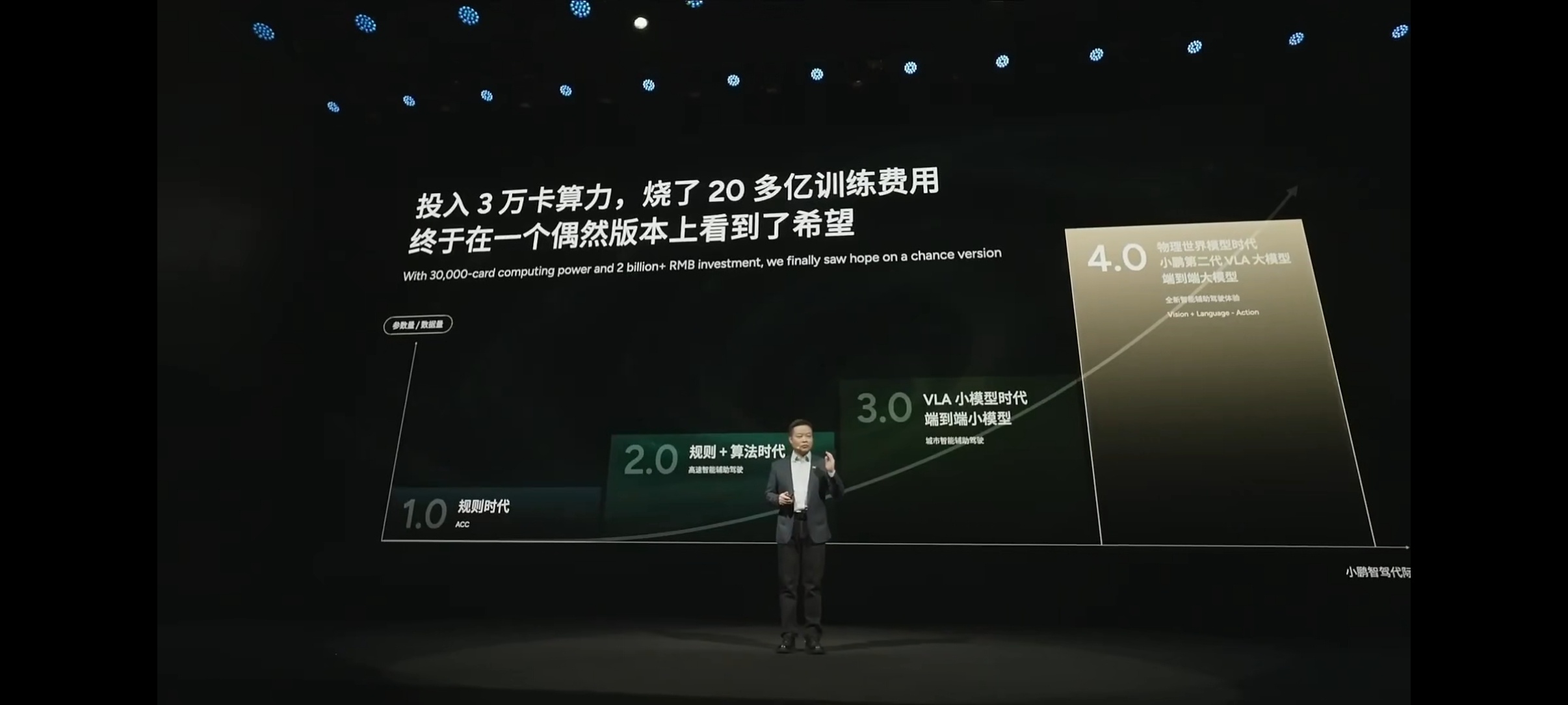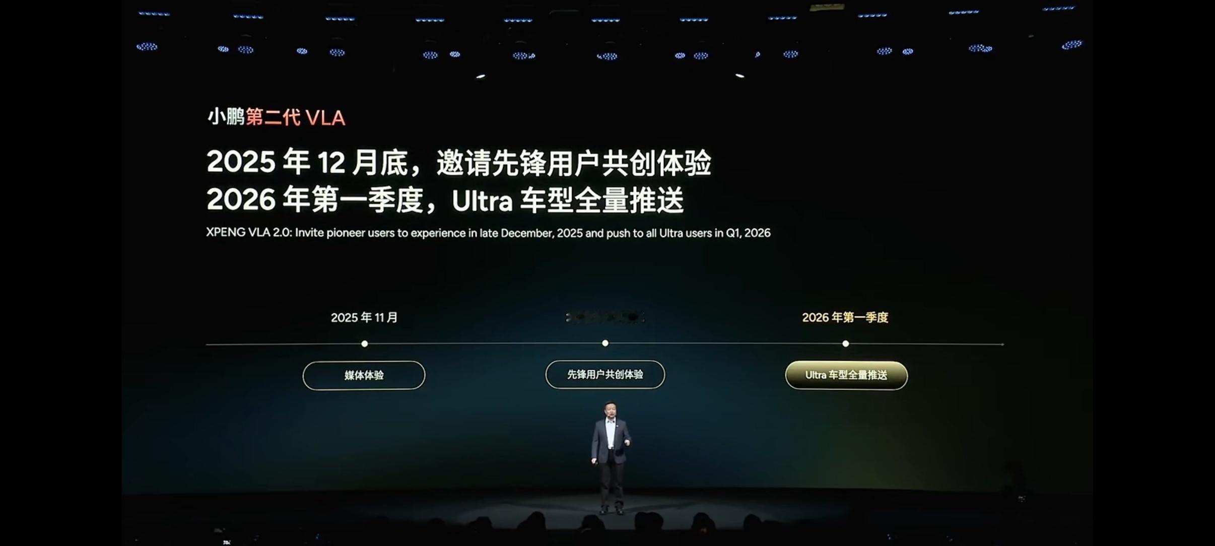 何小鹏首次披露物理AI巨大进展 小鹏2025科技日小鹏发布第二代VLA,用了接近1亿数据,阿里云3万张算力卡训练出来的,通过大幅缩减Language,提高学习能力,小路更强悍,大路更舒适,场景更全面,而且能丝滑过渡任何路段,降低人的接管率,大众是首发客户,图灵AI芯片也成大众定点,12月开放先锋用户试驾,明年1月全量推送到Ultra版上,另外MAX版小鹏也在试着实现,包括不开导航的人机共驾,明年都会有答案。