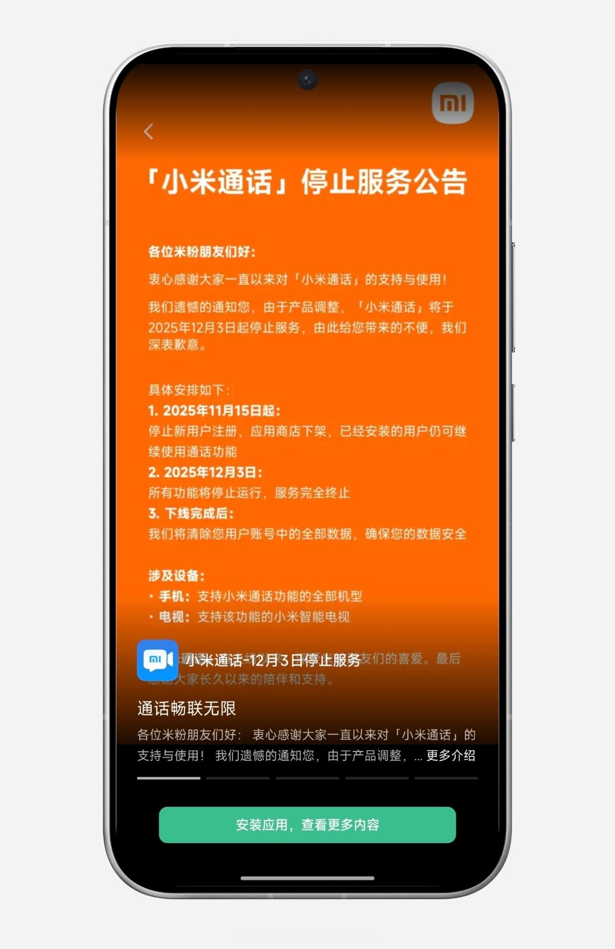 公告称,由于产品调整,小米通话将于 2025 年 12 月 3 日起停止服务。具体安排如下: