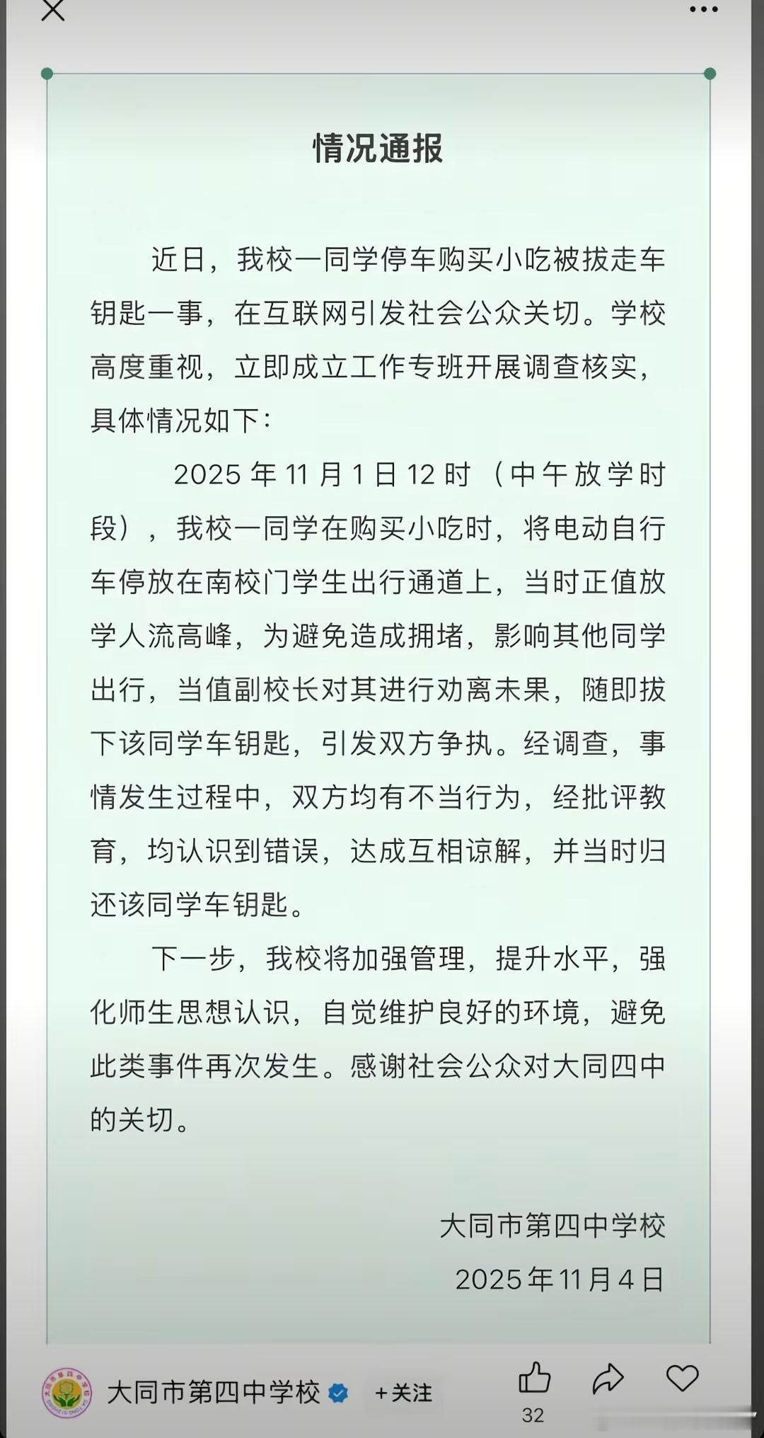 其通报来了,让人苦笑不得,感觉各打五十大板,放学女生饿了在校门口买根烤肠,惹到哪个校规了,拔钥匙的是副校长,这个通报中暴露了更多的问题,致命的漏洞,让人不吐不快