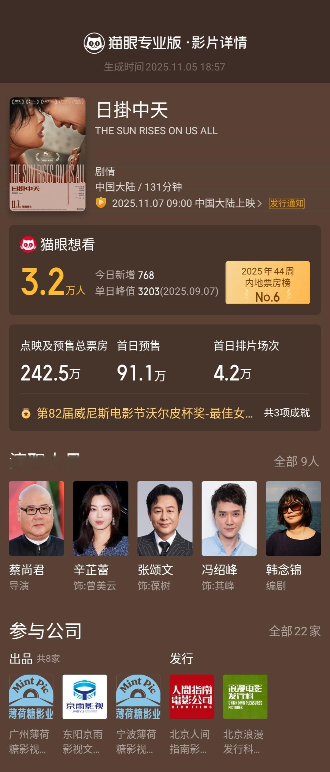 张小斐[超话]张小斐连包10场支持辛芷蕾新片 据猫眼专业版云包场显示, 连包10场支持辛芷蕾新片《日掛中天》,影片将于11月7日正式上映,截至当前点映及预售总票房已超242.5万。张小斐包场支持日掛中天