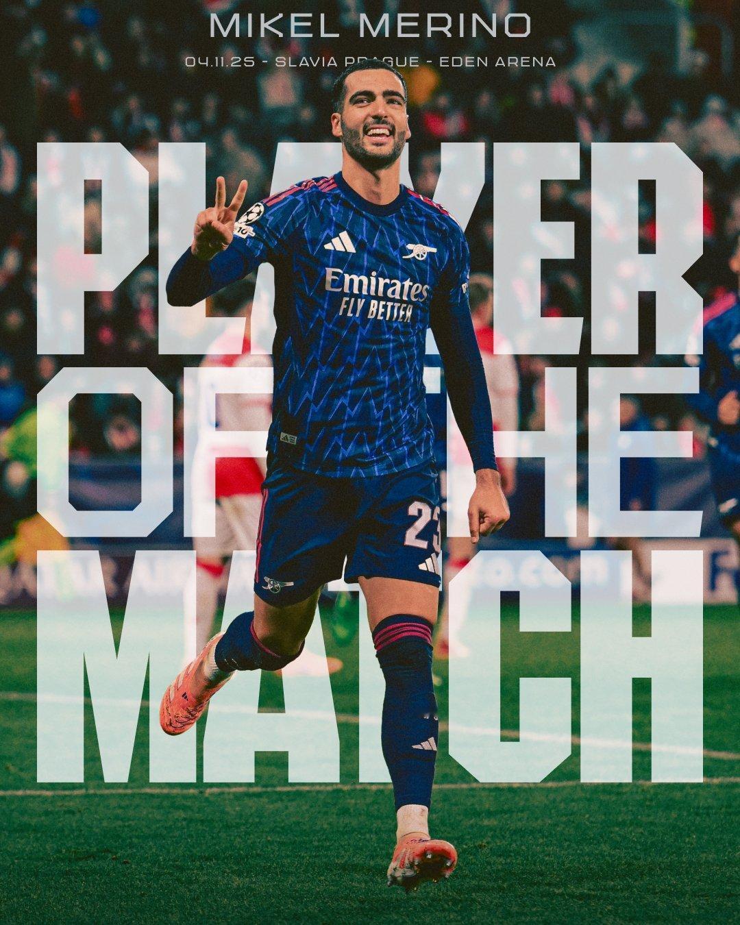 阿森纳官推:梅里诺被评为布拉格斯拉维亚vs阿森纳 比赛的最佳球员🏆