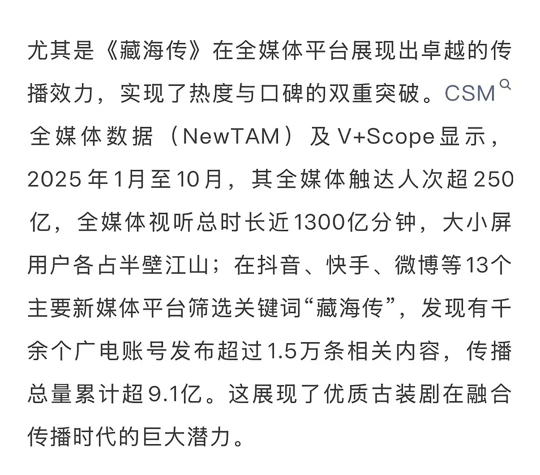 爱吹csm的有福了,csm刚官方发布:25年《藏海传》以6.43%总收视率获上半