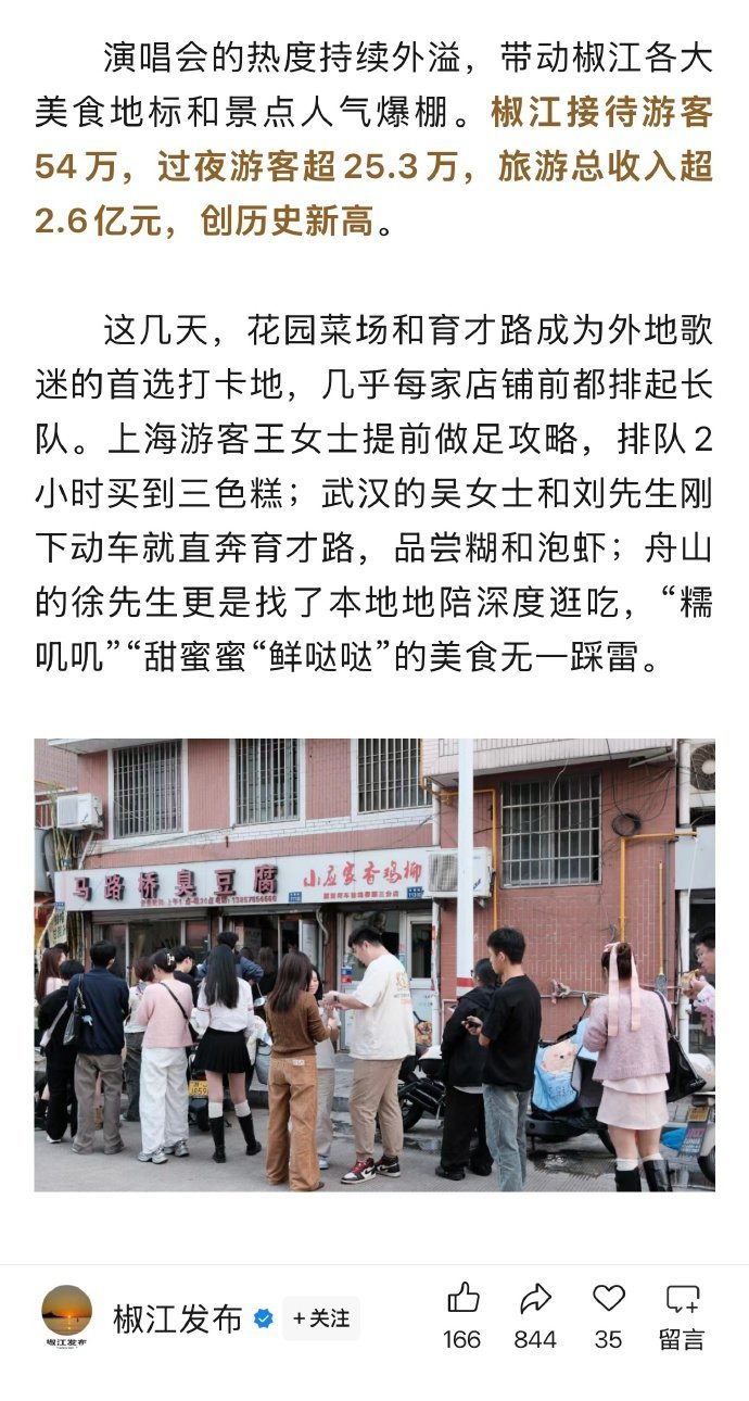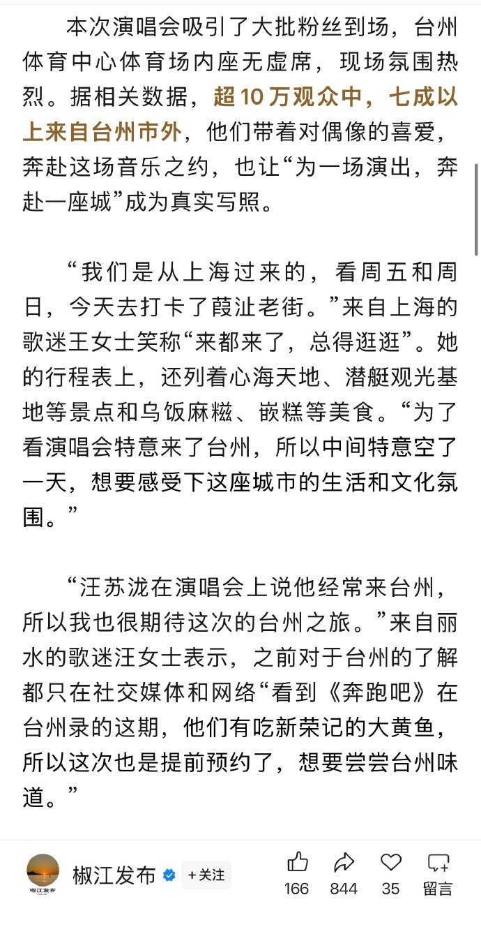 汪苏泷演唱会带动效应显著 汪苏泷台州开唱热度拉满,超10万观众拉动文旅,椒江过夜游客超25.3万,2.6亿旅游收入刷新纪录。