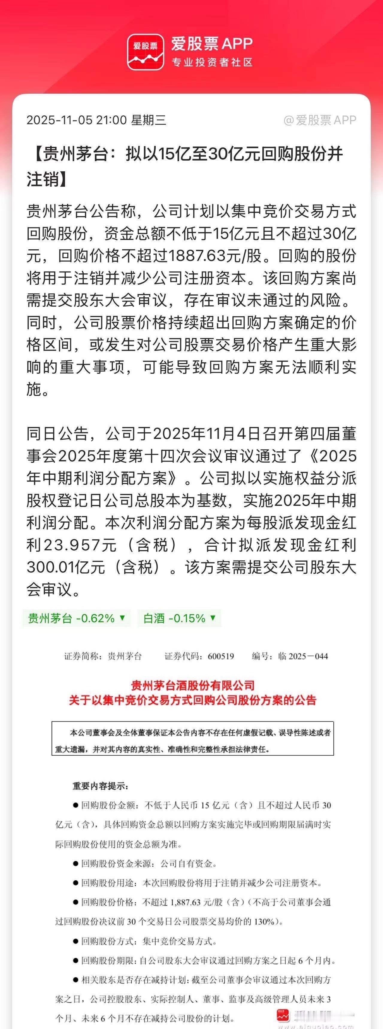 茅台又出手了,15亿至30亿元回购股份并注销,回购价格不超过1887.63元!对市值1.78万亿的茅王来说,这点回购金额少了点,但总归是好事吧。
