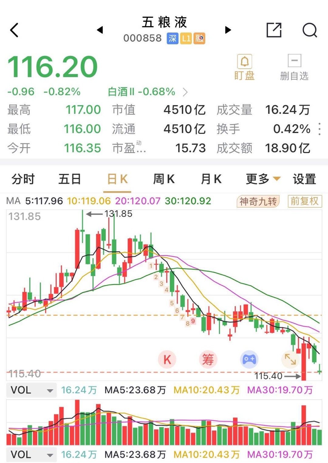 五粮液全天在116.0元—117.0元之间窄幅震荡,收跌0.84%,全天振幅仅0.85%,继续保持无量阴跌之势。