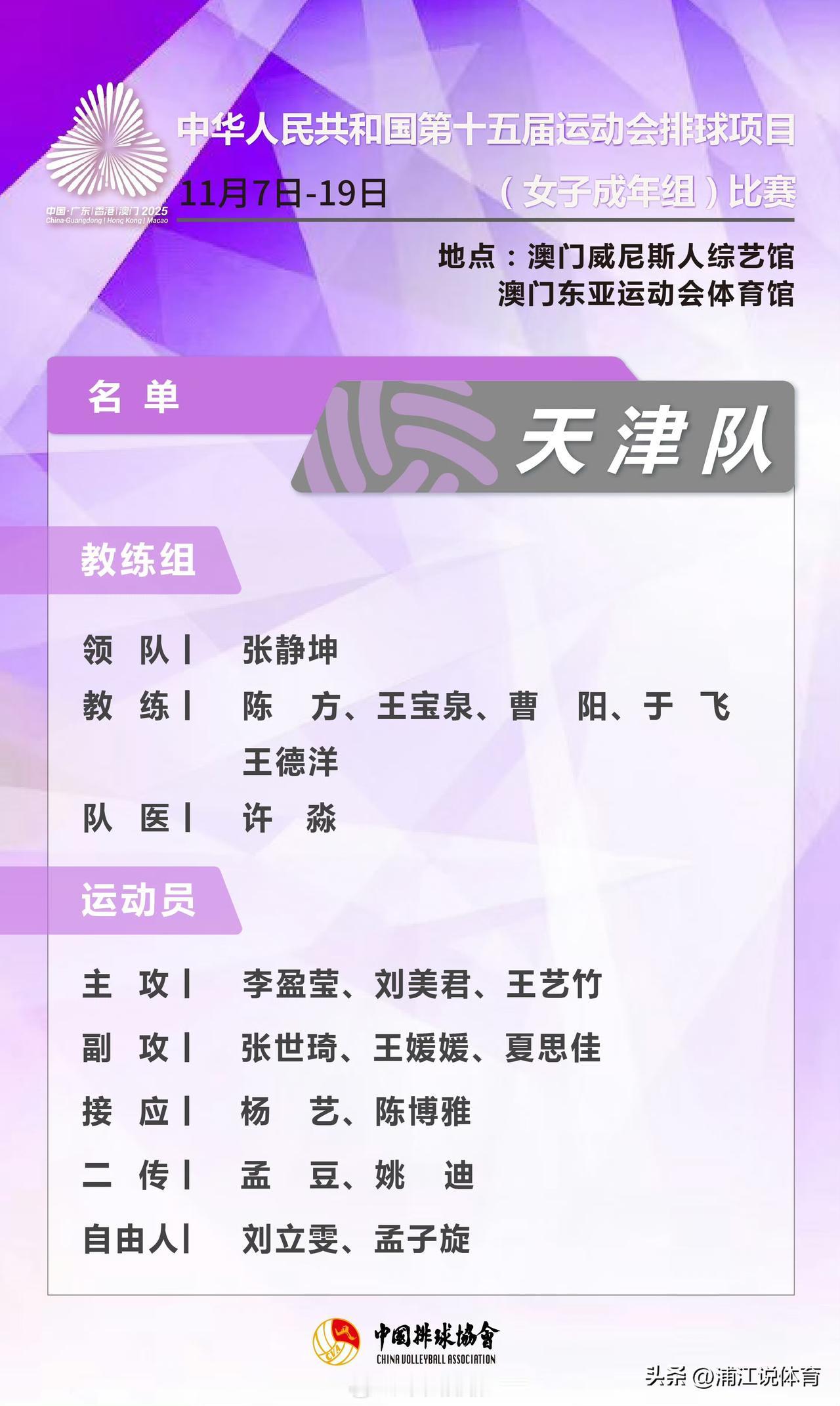 中国排协公布天津女排全运会教练团队名单:曹阳在列。在此前流出的大合影中,曹阳没有参与合影,引起球迷热议。不过根据中国排协公布的天津女排全运会参赛名单中,曹阳的名字排序仅次于陈方、王宝泉,高于国家队教练于飞。而另一位中国女排教练团队的核心成员袁灵犀不在天津女排出征之列。袁灵犀在今年9月中旬再当爹,应该是利用国家队没有比赛的日子好好享受阖家团圆的日子了。