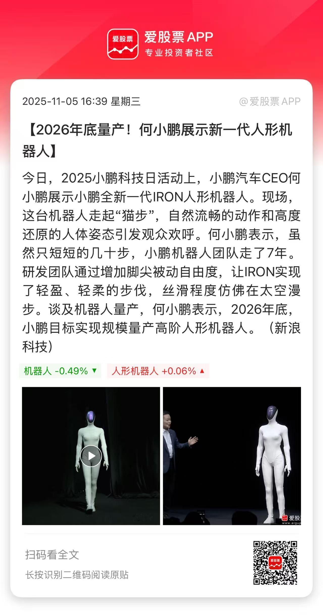 今天小鹏发布全新一代IRON人形机器人,是国内首个量产高阶机器人! 小鹏这次做人形机器人真的很像人,女性化特征非显。不得不说,这一次小鹏确实是花了心思。 何小鹏也画了个大饼,汽车现在全球是10万亿美金的市场,但机器人会是20万亿美金的市场。就问你们信不信呢? 不过小鹏在美股大跌4%,市场直接利好兑现,这就有点尴尬了。未来两个月机器人方向会有比较多的刺激,海内外新品都会陆续发布和定型,但重点还是特斯拉,马斯克才是宇宙第一吹神,黄仁勋只能排第二。