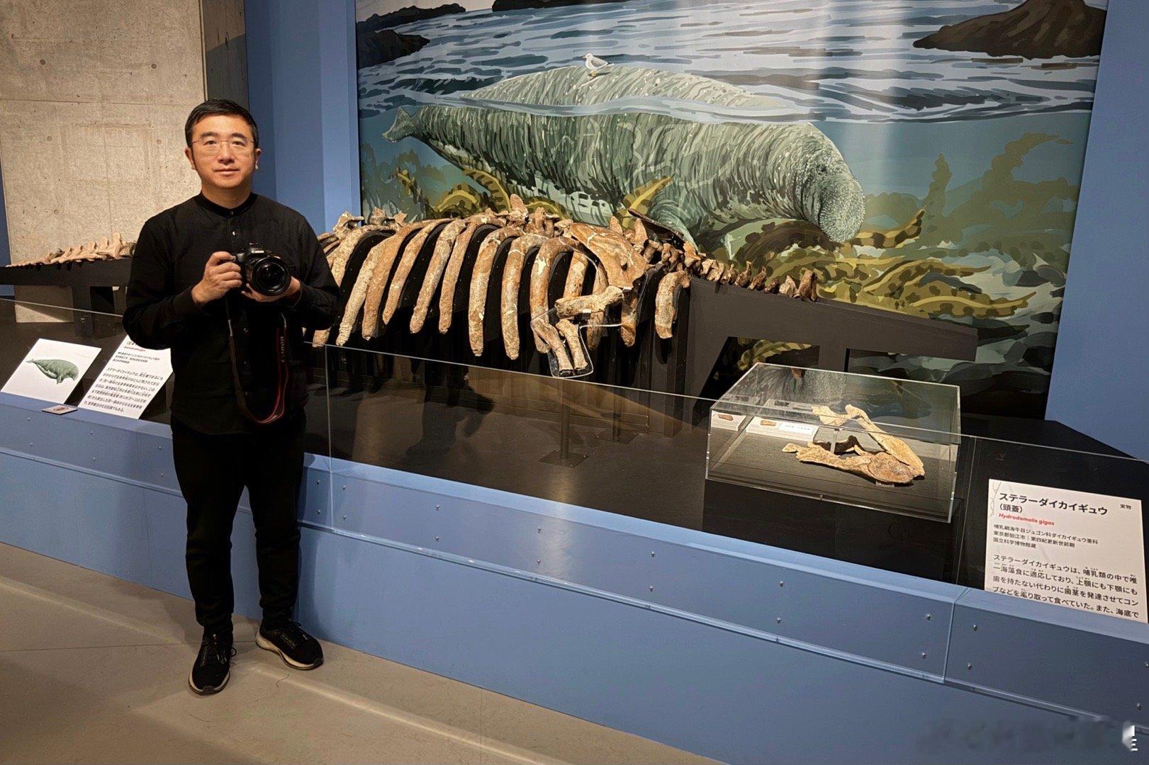 展览的最后聚焦新生代,用浅蓝表示。尽管这一时期没有发生大规模物种灭绝事件,但剧烈的气候变化和人类活动,给生物世界带来了巨大的变化。本次特展最重要的展品是图9,全球首次公开展出的、长度约6米的大海牛化石。这是2006年在东京多摩川左岸发现的136-110万年前的大海牛化石,也是已知最古老的大海牛化石。这个物种是18世纪中期发现的,结果被人类过量捕杀,到1768年就灭绝了。这也提醒人类,自然环境有相当的脆弱性,如果肆意妄为,也许会导致可怕的结果。