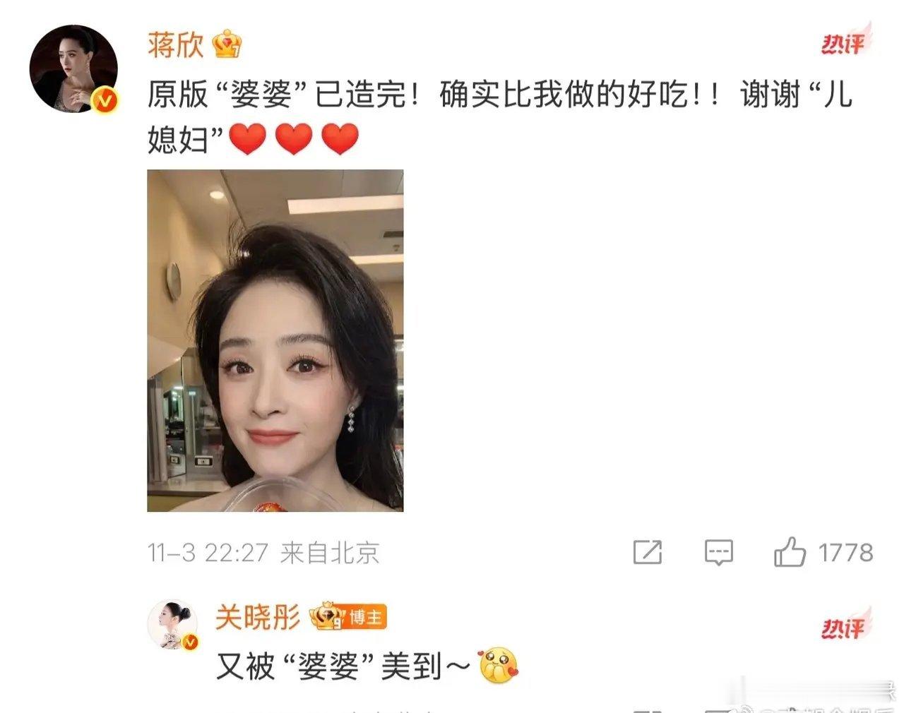 关晓彤晒出可可爱爱的下班图,随后蒋欣现身评论区,表示自己吃了关晓彤做的“彩椒碗”,再次自称关晓彤的婆婆,她打趣道:“原版‘婆婆’已造完!确实比我做的好吃!!谢谢‘儿媳妇’ ”关晓彤也回复:“又被“婆婆”美到~” 好温馨的《小巷人家》售后!林栋哲在哪里?怎么还没来报到!