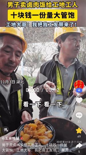 湖北,一男子卖卤肉饭,10元一大份,一工地工人点了一次,再来时,叫上了好多工友。网友:10元的盒饭都是男人在吃,10元的奶茶都是女人在喝,这就是男人… 11月3日,一男子在道路边卖卤肉饭。有一天,来了一工地大哥点了一大份,价格10元。看着视频里的卤肉饭的份量是真的挺足的,而且价格是真的很实惠。 也许是份量足能吃饱,再加上价格便宜吧,这个工地大哥再来的时候,叫上了一大批工地的工友。 工地大哥说:你看,我都给你喊过来了。买卤肉饭的男子也是懂感恩的,看到大哥给自己拉来这么多人连忙说了声:谢谢哥,谢谢哥。 还有工地的工人惊讶表示:噢,搞那么多呀! 有网友说:这种实惠的就是要给他流量,这样他才能坚持下去,收益也是工地得工人啊!10块钱可以吃到这么多肉菜,很实惠。 也有网友表示,量这么大,不知道有没有利润。有网友跟帖说:人家要的是流量,不是利润。但是其实不管怎么说要流量也好,或者薄利多销也好,卤肉饭卖得这么便宜,而且有干净,其实受惠的还是我们的消费者的。 温暖相遇,善良相惜! 暖心瞬间 暖心 暖心正能量 温暖 善良 分享一张你摆摊的照片 工地 你对路边流动摆摊商贩持啥态度 信息来源:玉林晚报