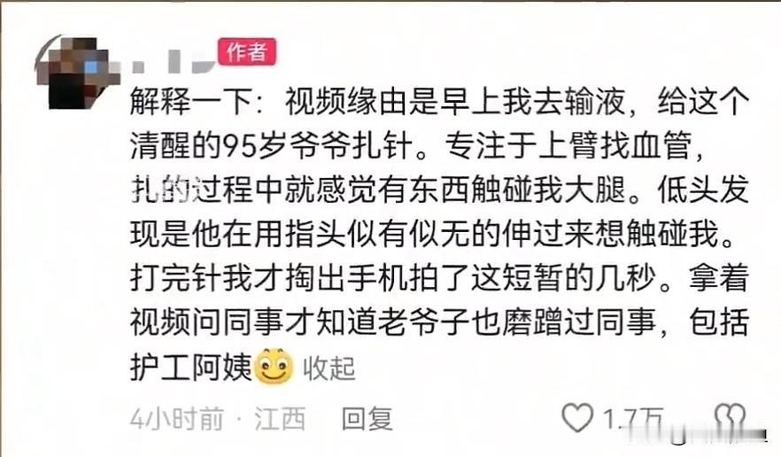 刷到一个视频,一个护士给95岁老头扎针,结果被摸腿了! 护士正专心在他胳膊上找血管呢,冷不丁感觉大腿那儿有东西毛毛地碰。低头一看,好家伙,老爷子手指头正跟那儿似有似无、试探着想蹭过来呢!护士妹子挺稳,扎完针才悄悄录了几秒留证据。回头一问同事,护工阿姨直摆手:“别提了,这位老爷子啊,我们几个都‘熟悉’他这小动作!” 这精神头儿用的地儿…真让人哭笑不得。